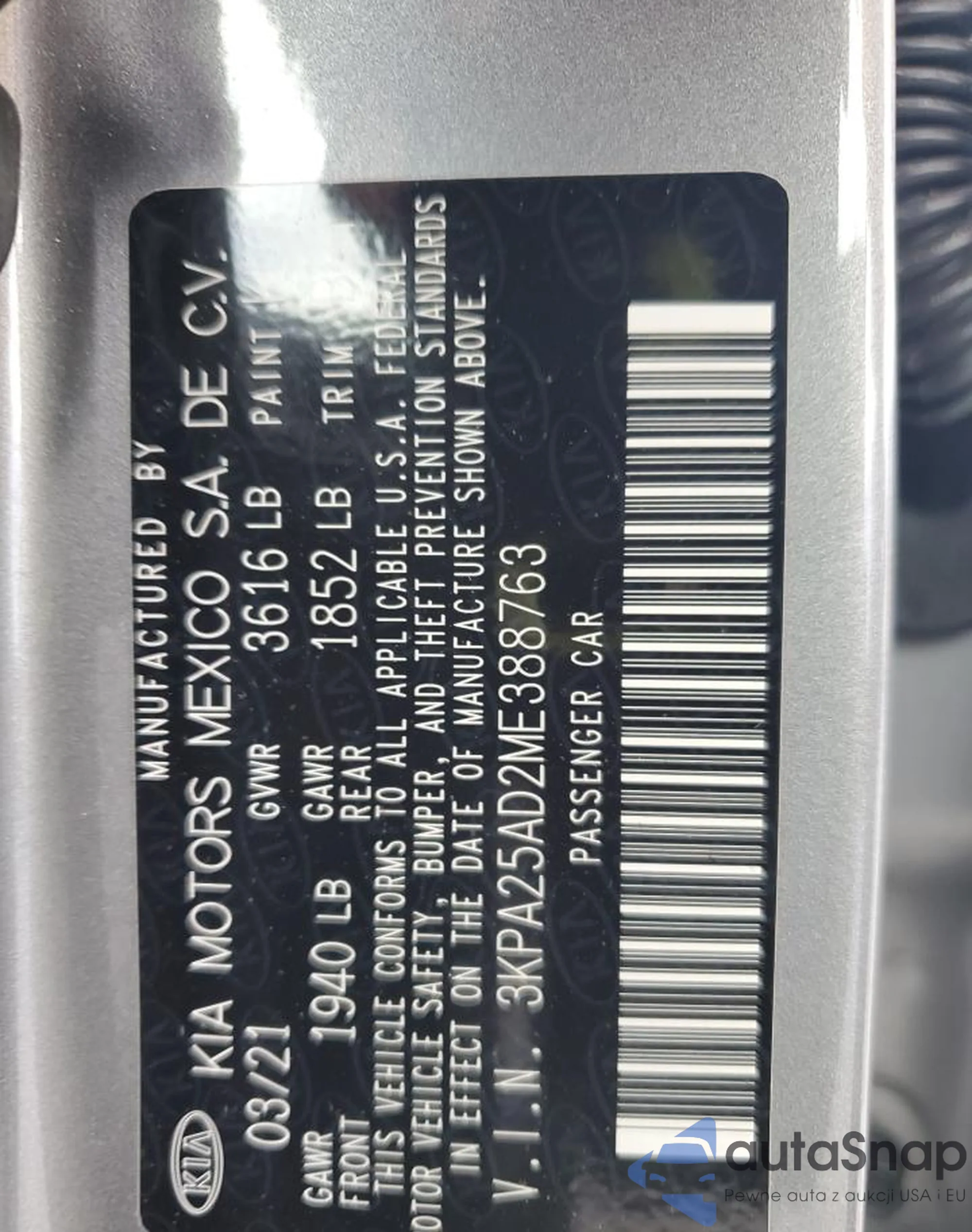 • VIN 3KPA25AD2ME388763