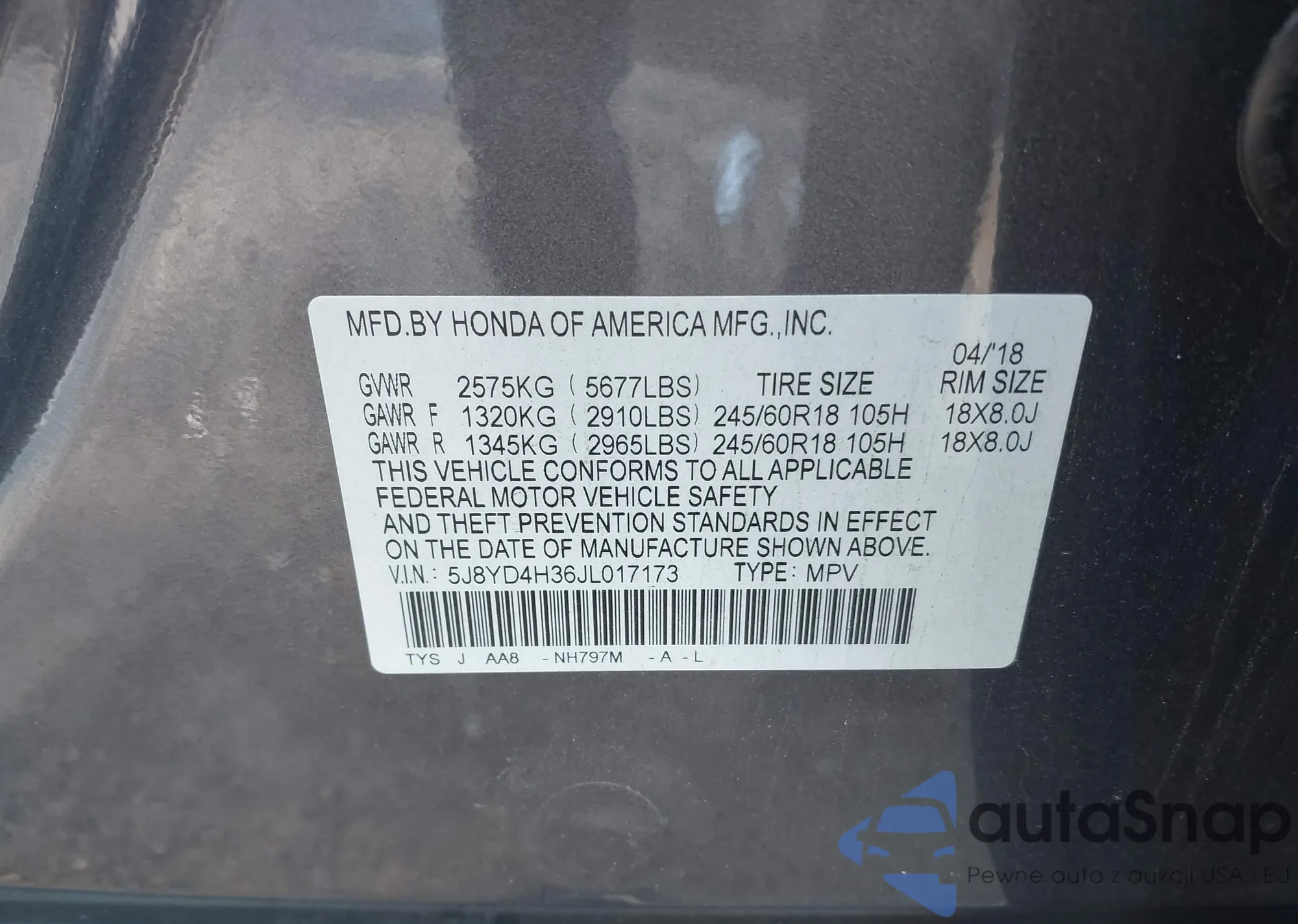 • VIN 5J8YD4H36JL017173