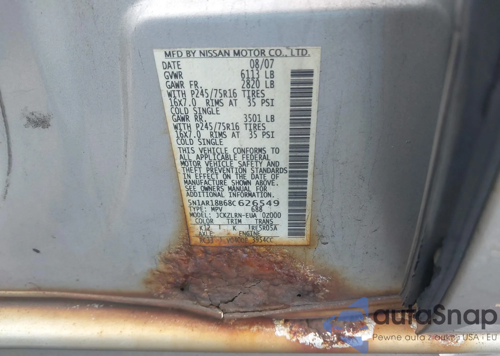 • VIN 5N1AR18B68C626549