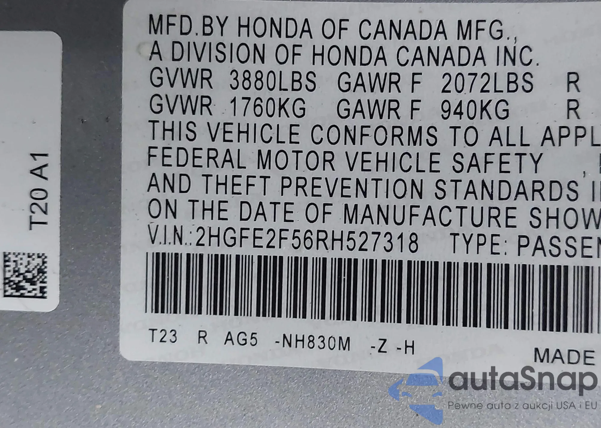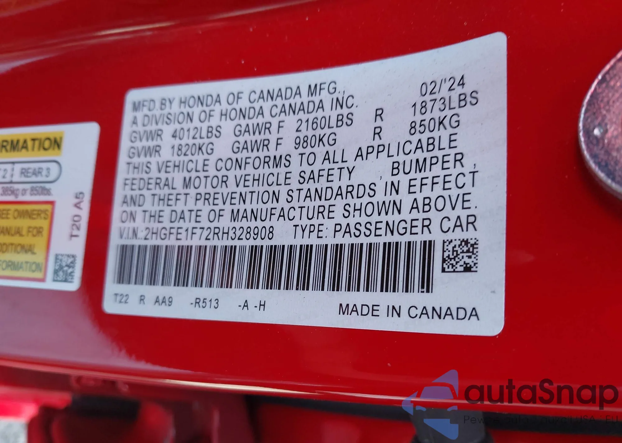 LOT: 40960686 VIN: 2HGFE1F72RH328908
