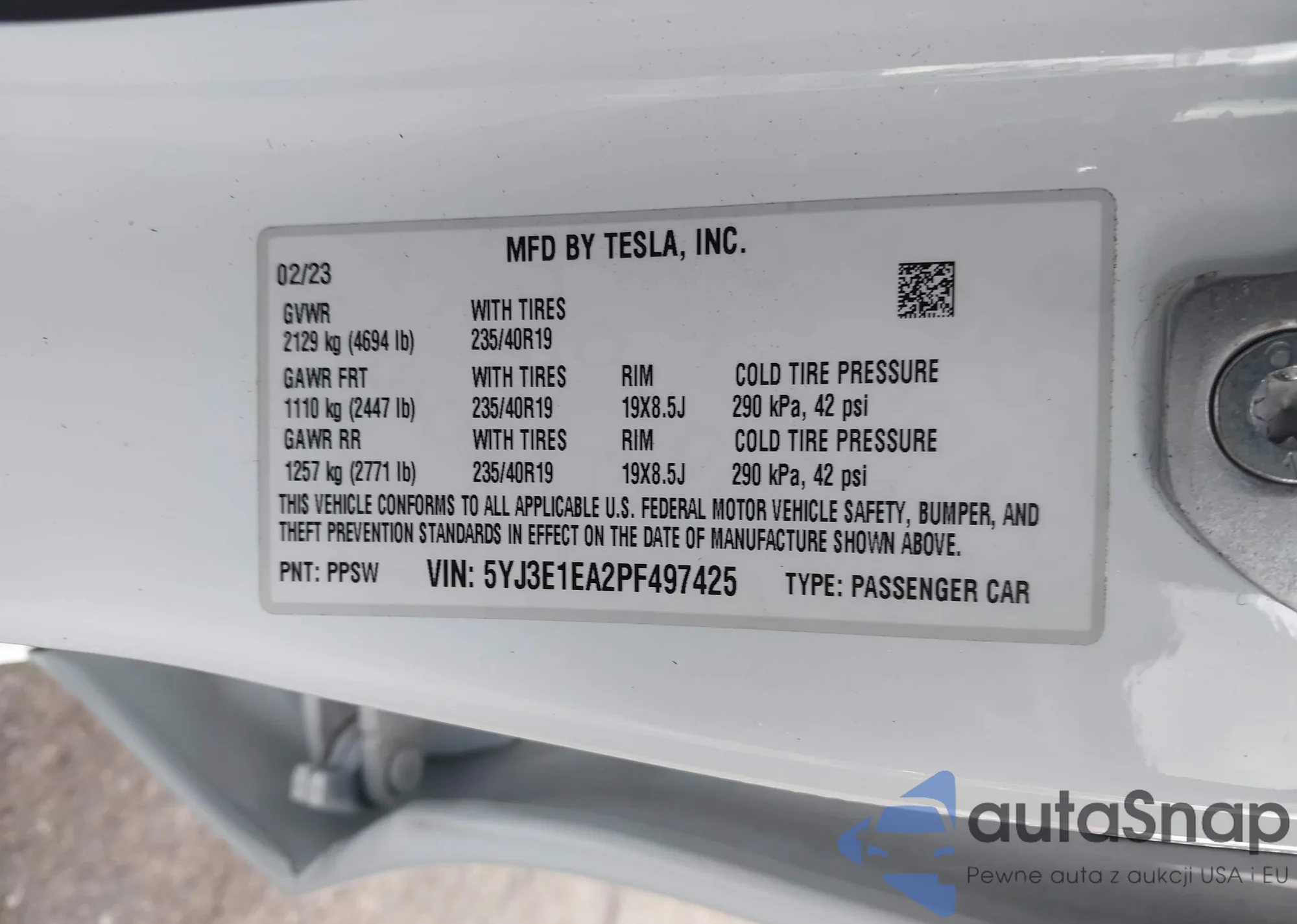 • VIN 5YJ3E1EA2PF497425