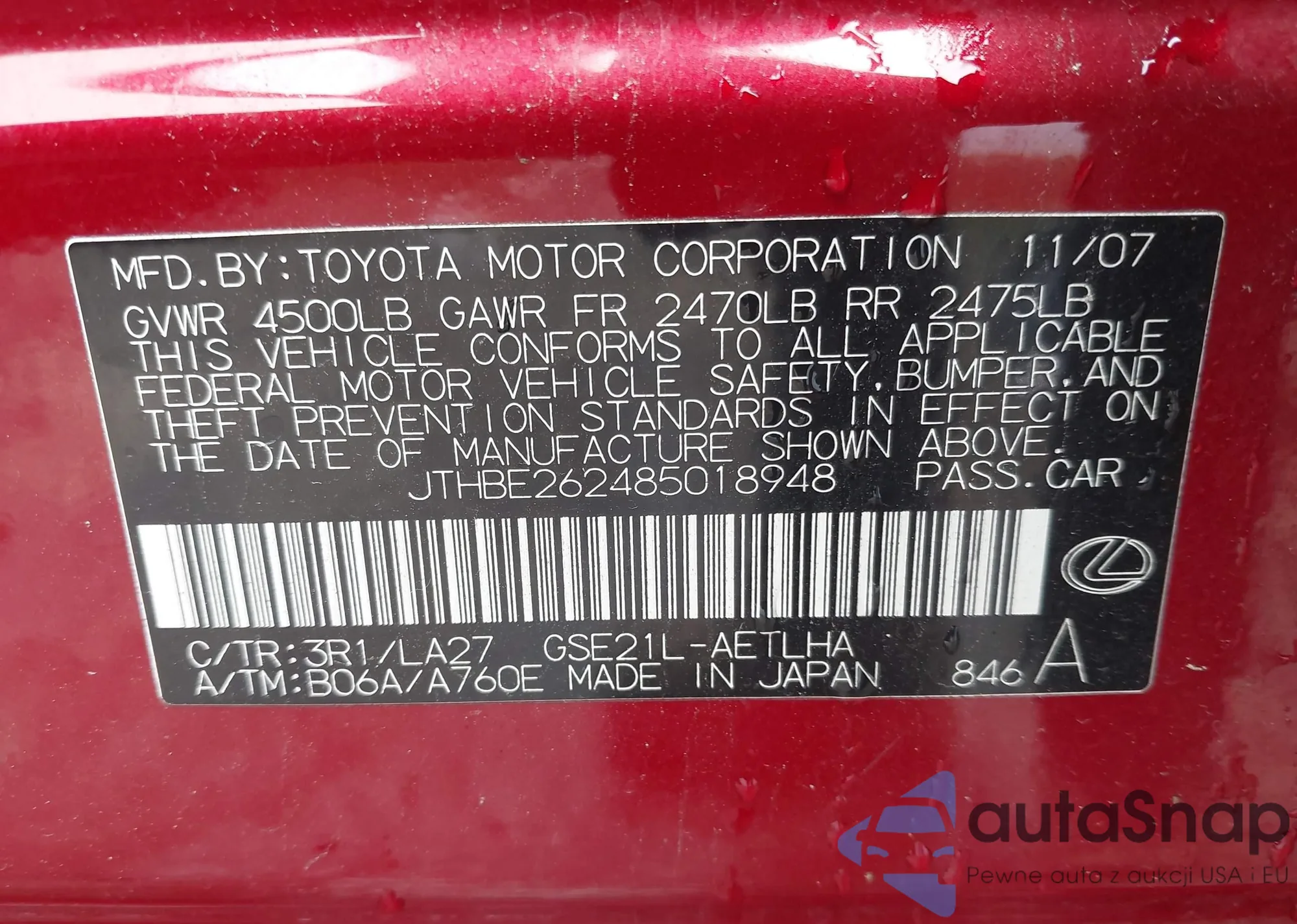 LOT: 41591094 VIN: JTHBE262485018948