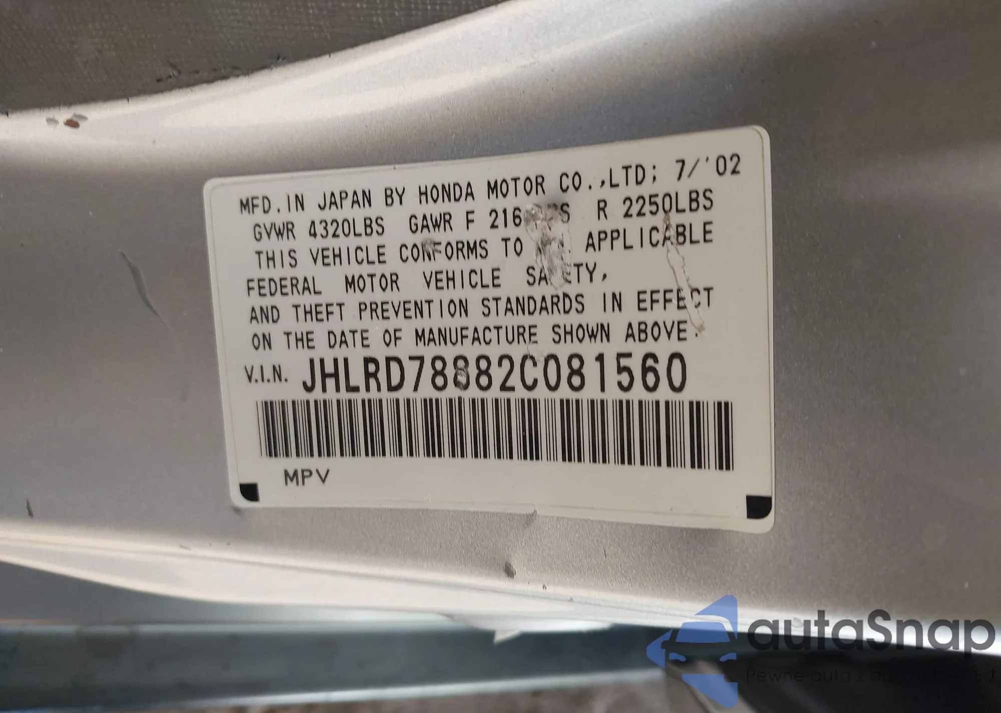 • VIN JHLRD78882C081560