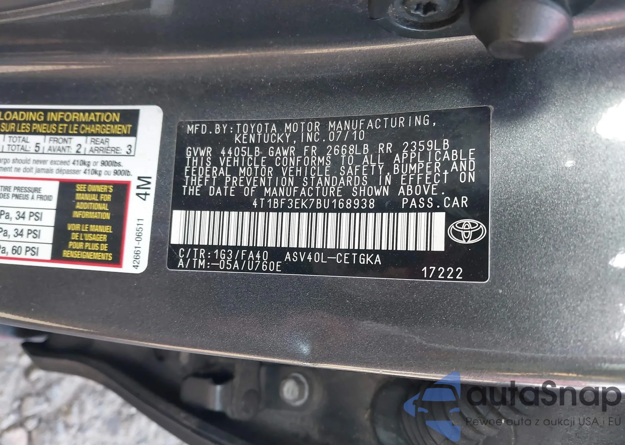 • VIN 4T1BF3EK7BU168938