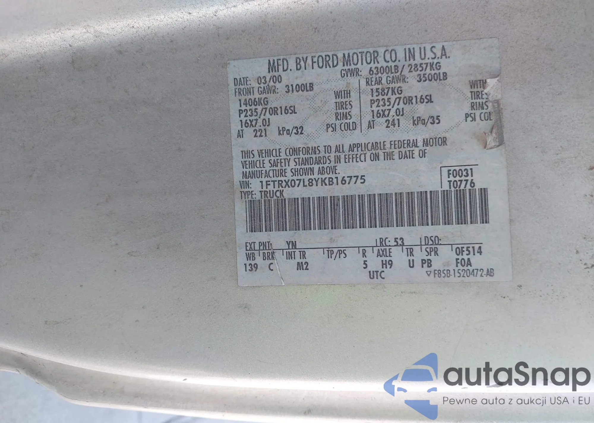 • VIN 1FTRX07L8YKB16775
