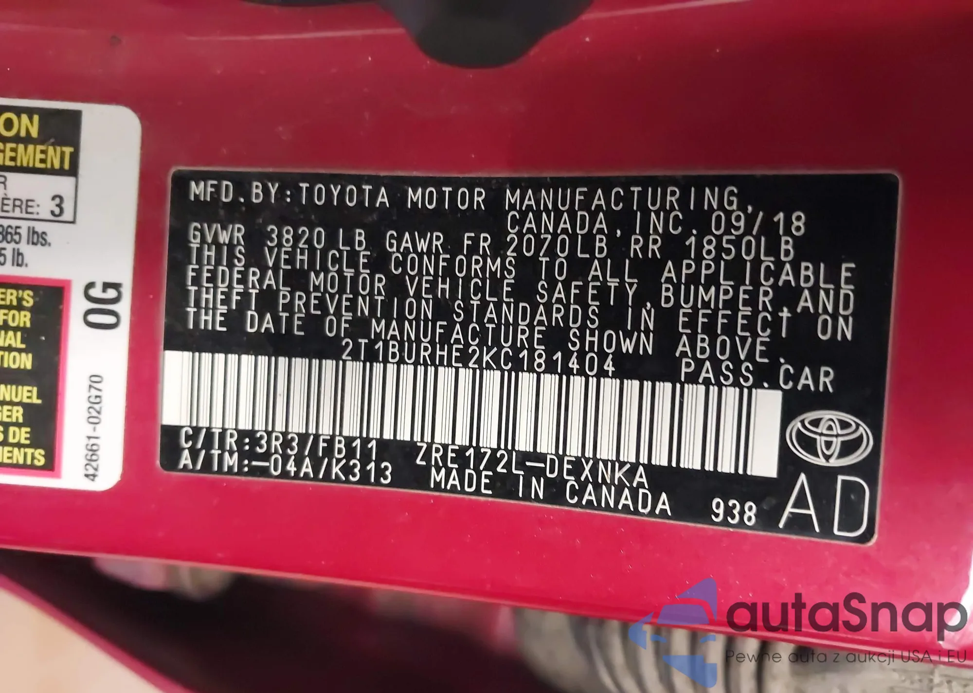 • VIN 2T1BURHE2KC181404