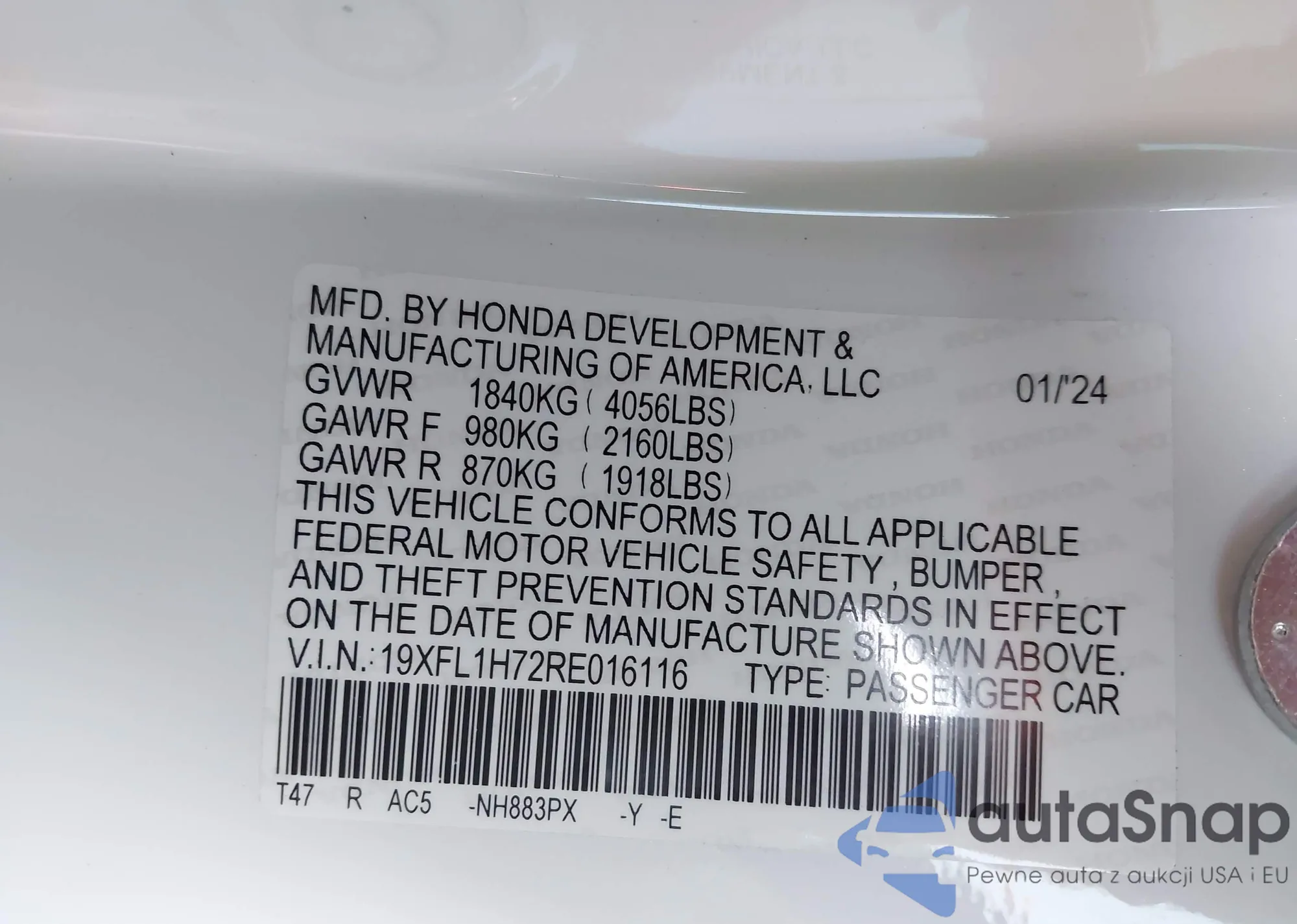 • VIN 19XFL1H72RE016116