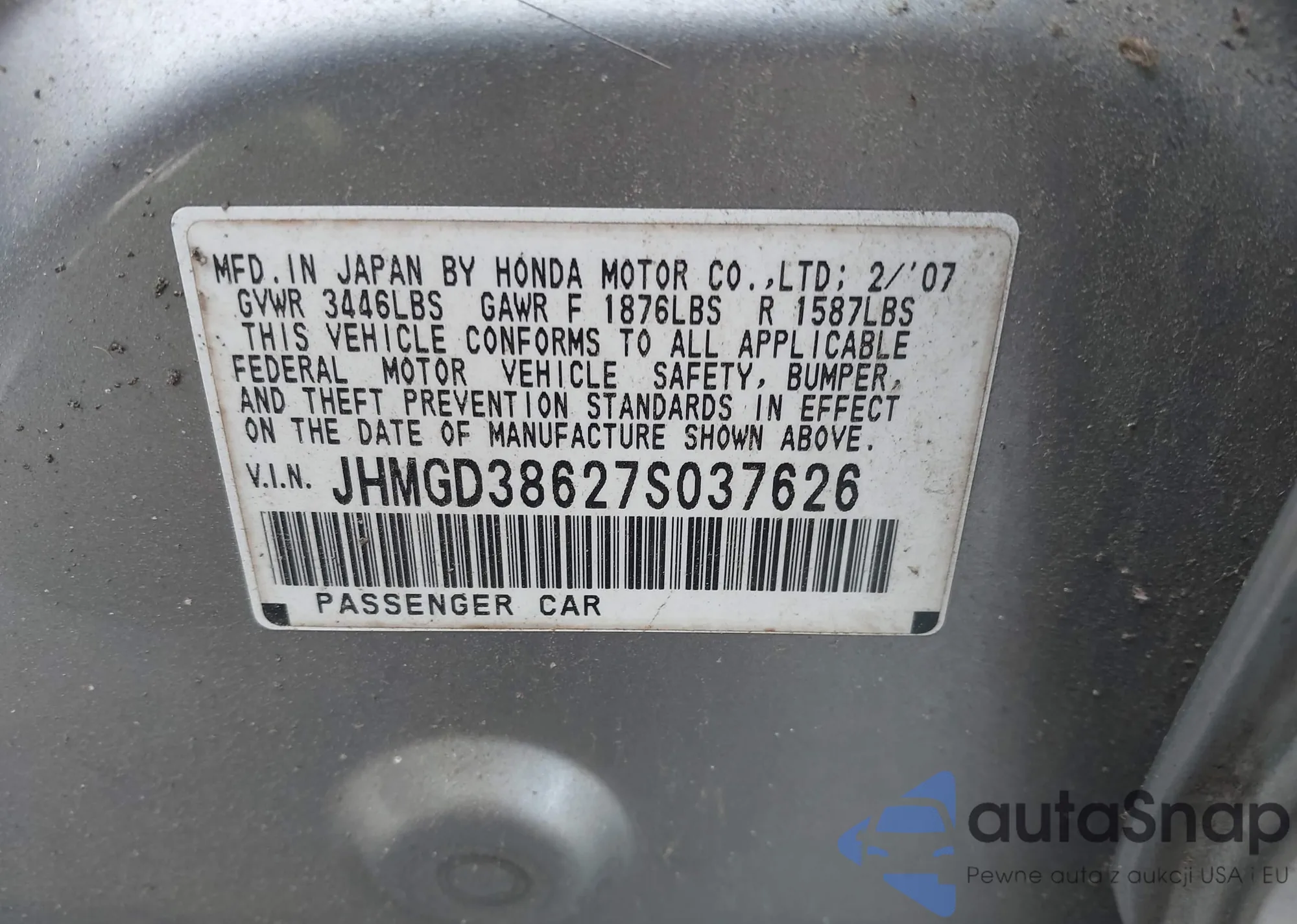LOT: 41644888 VIN: JHMGD38627S037626