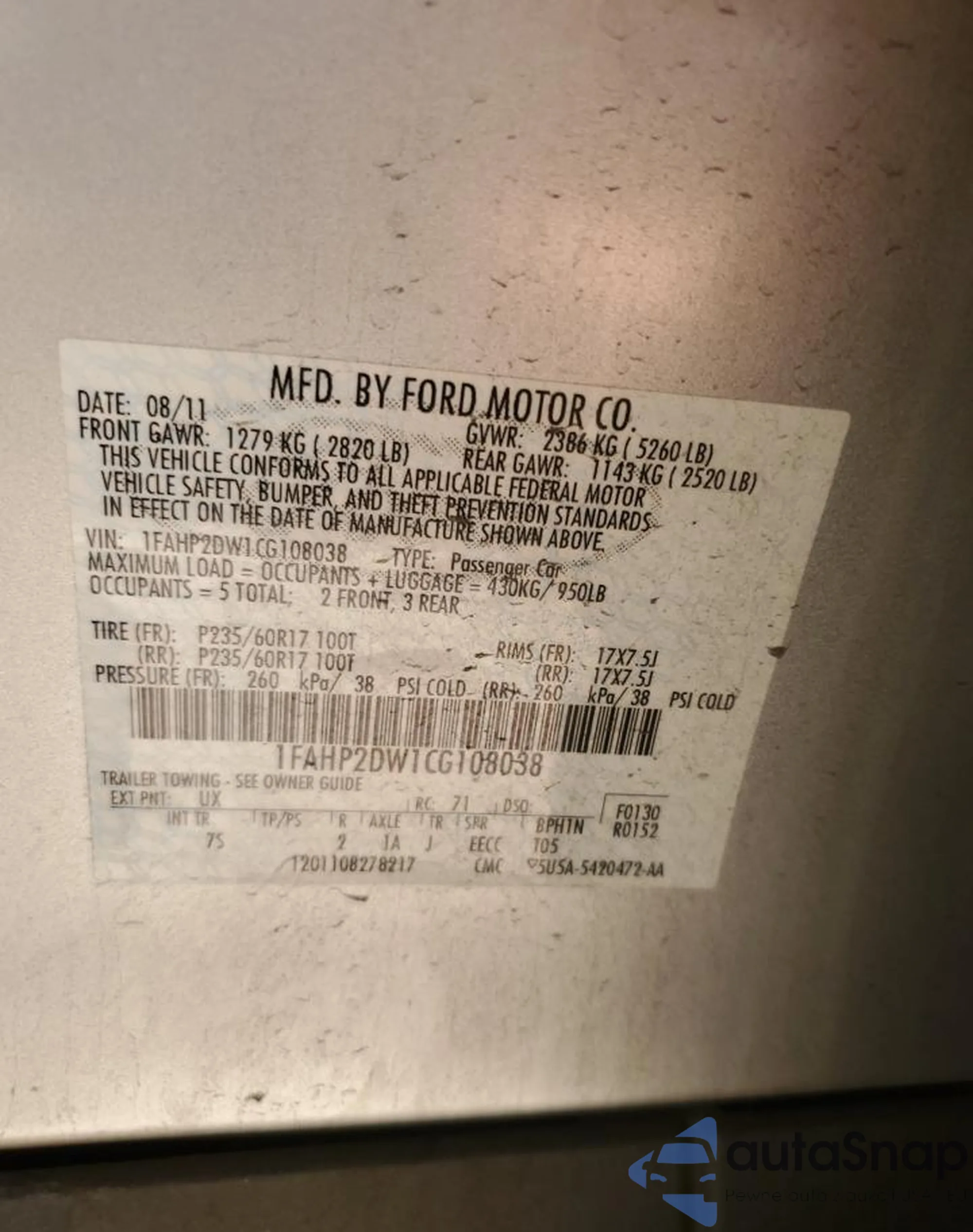 • VIN 1FAHP2DW1CG108038