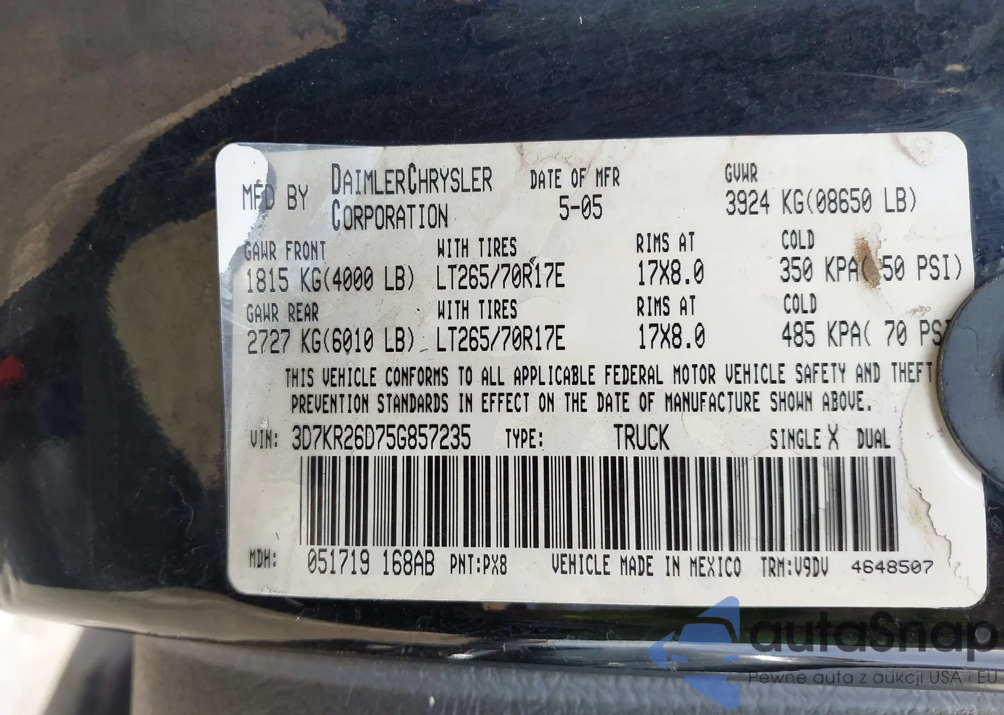 • VIN 3D7KR26D75G857235