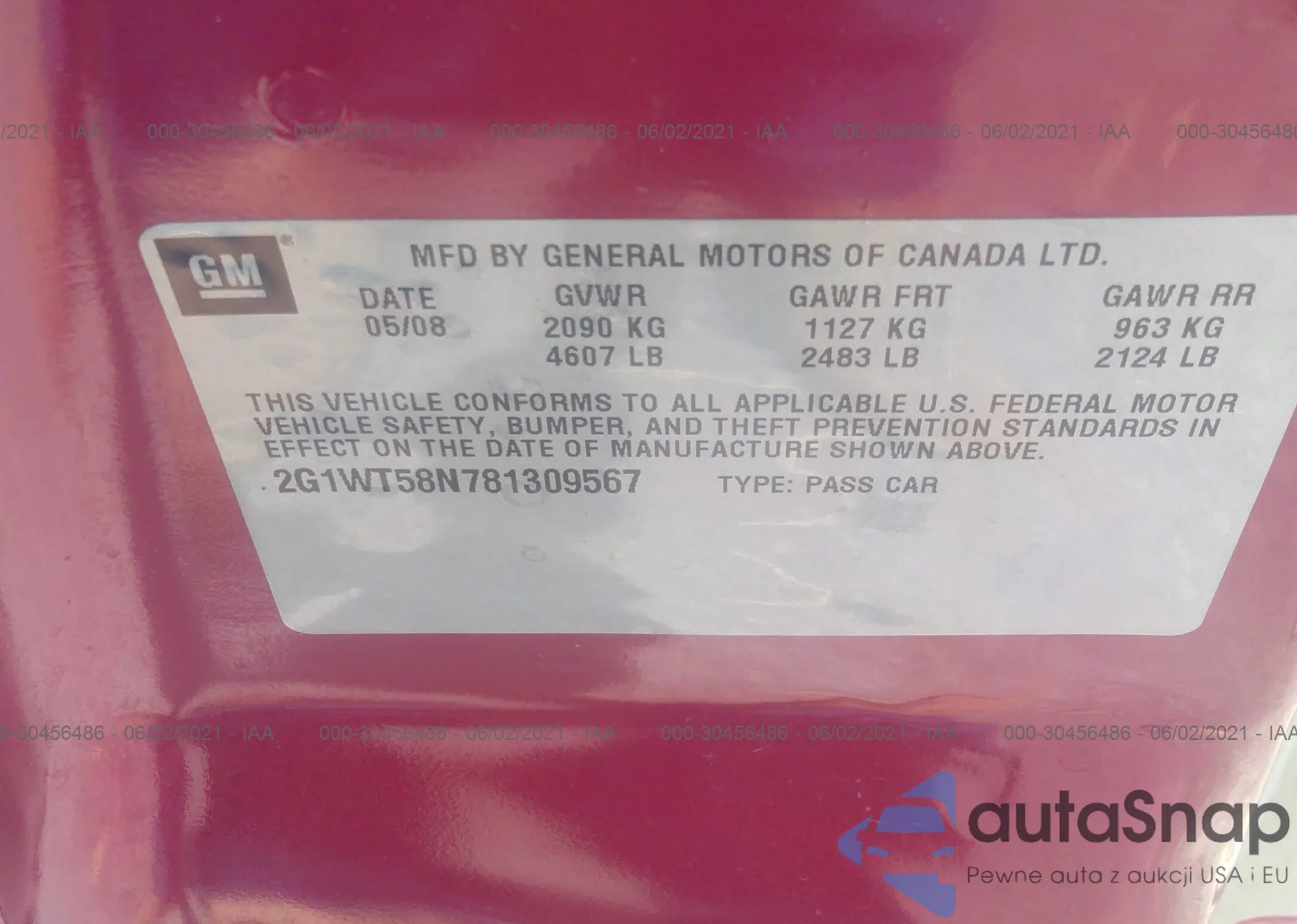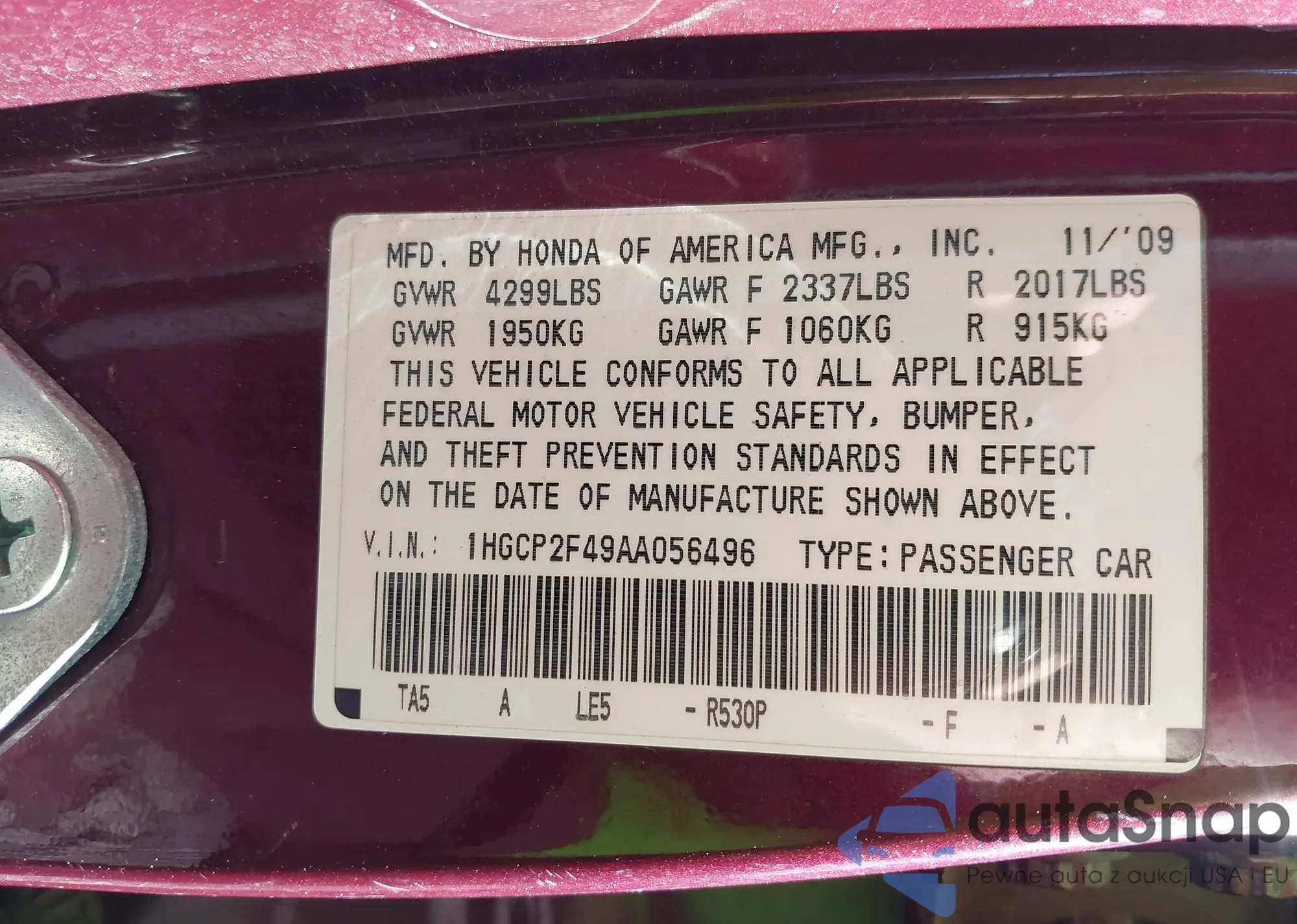 LOT: 41698085 VIN: 1HGCP2F49AA056496
