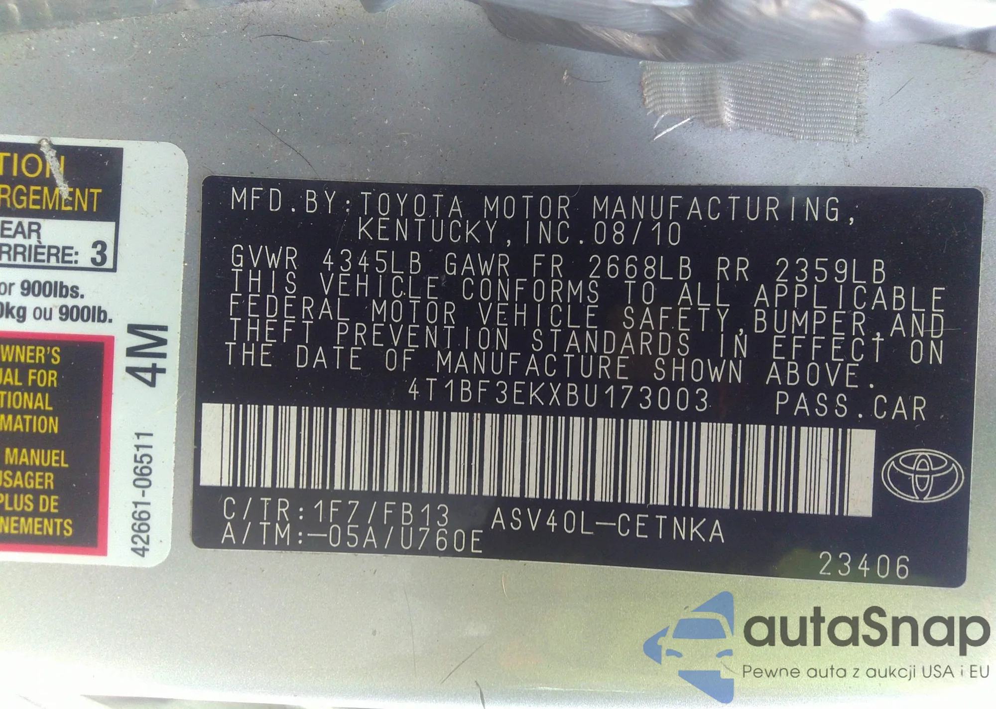 • VIN 4T1BF3EKXBU173003