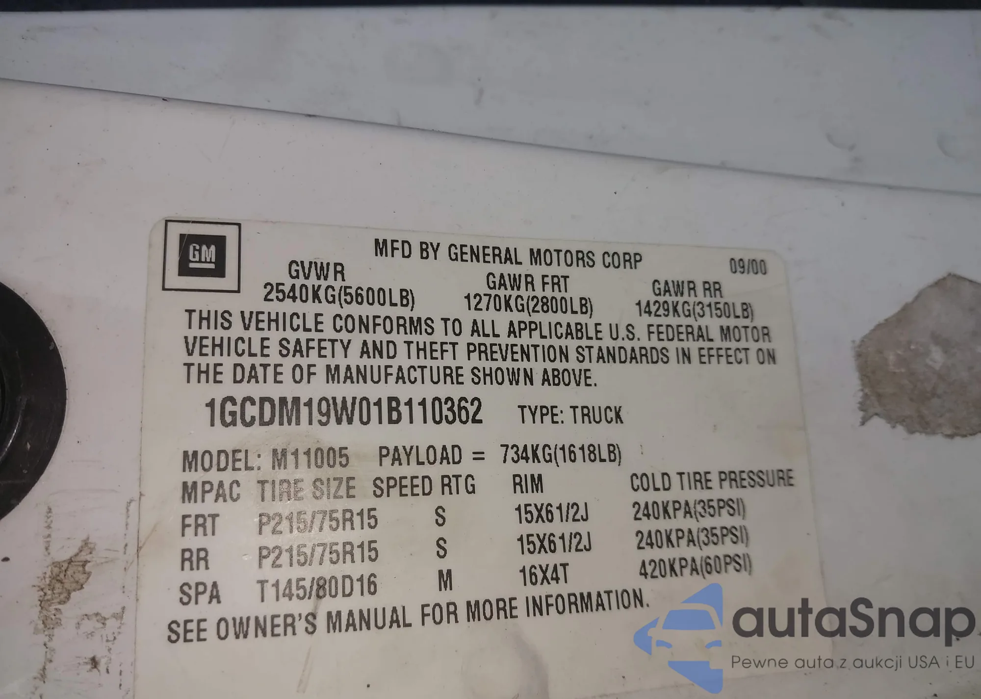 LOT: 40184014 VIN: 1GCDM19W01B110362