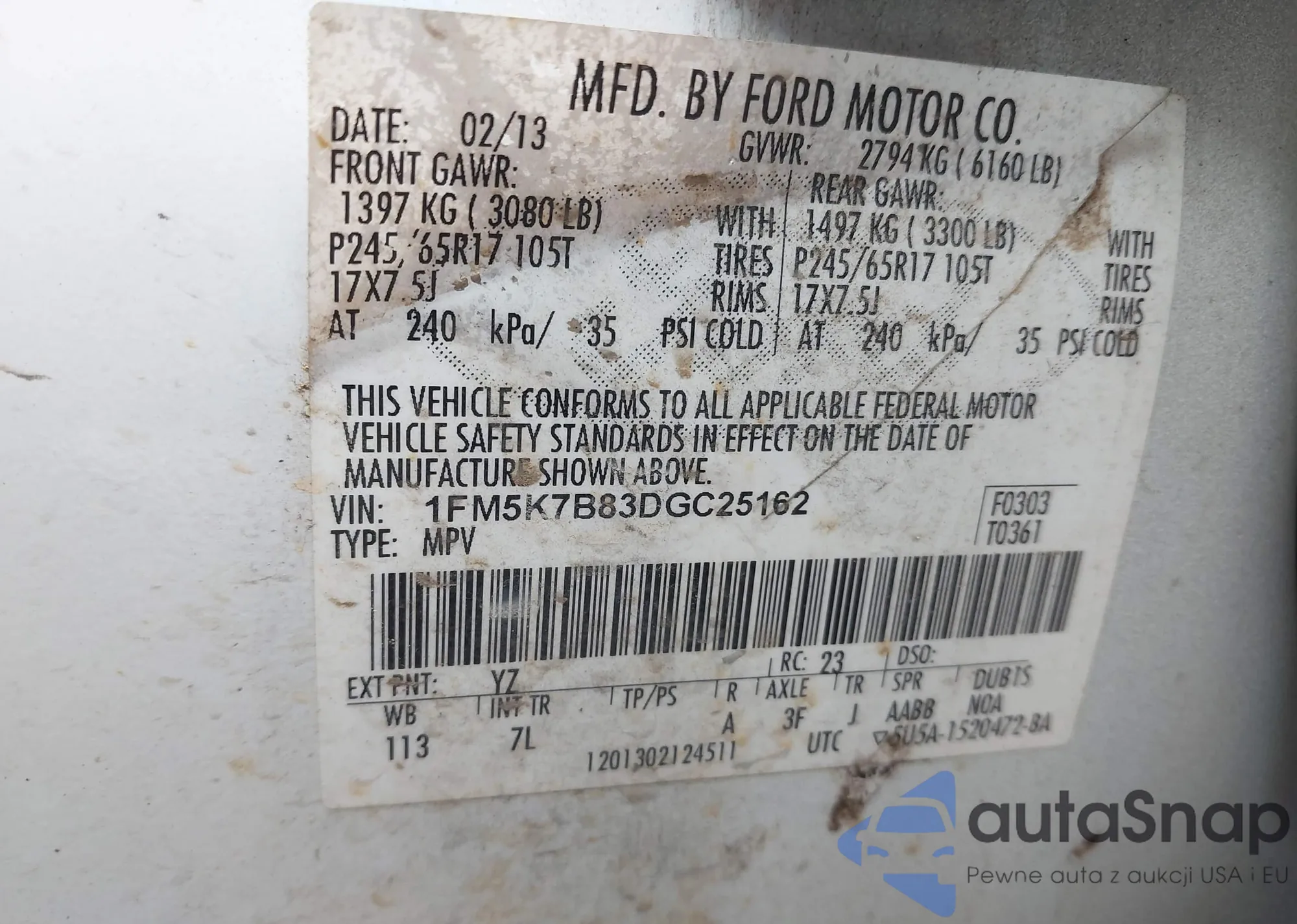 LOT: 41703830 VIN: 1FM5K7B83DGC25162