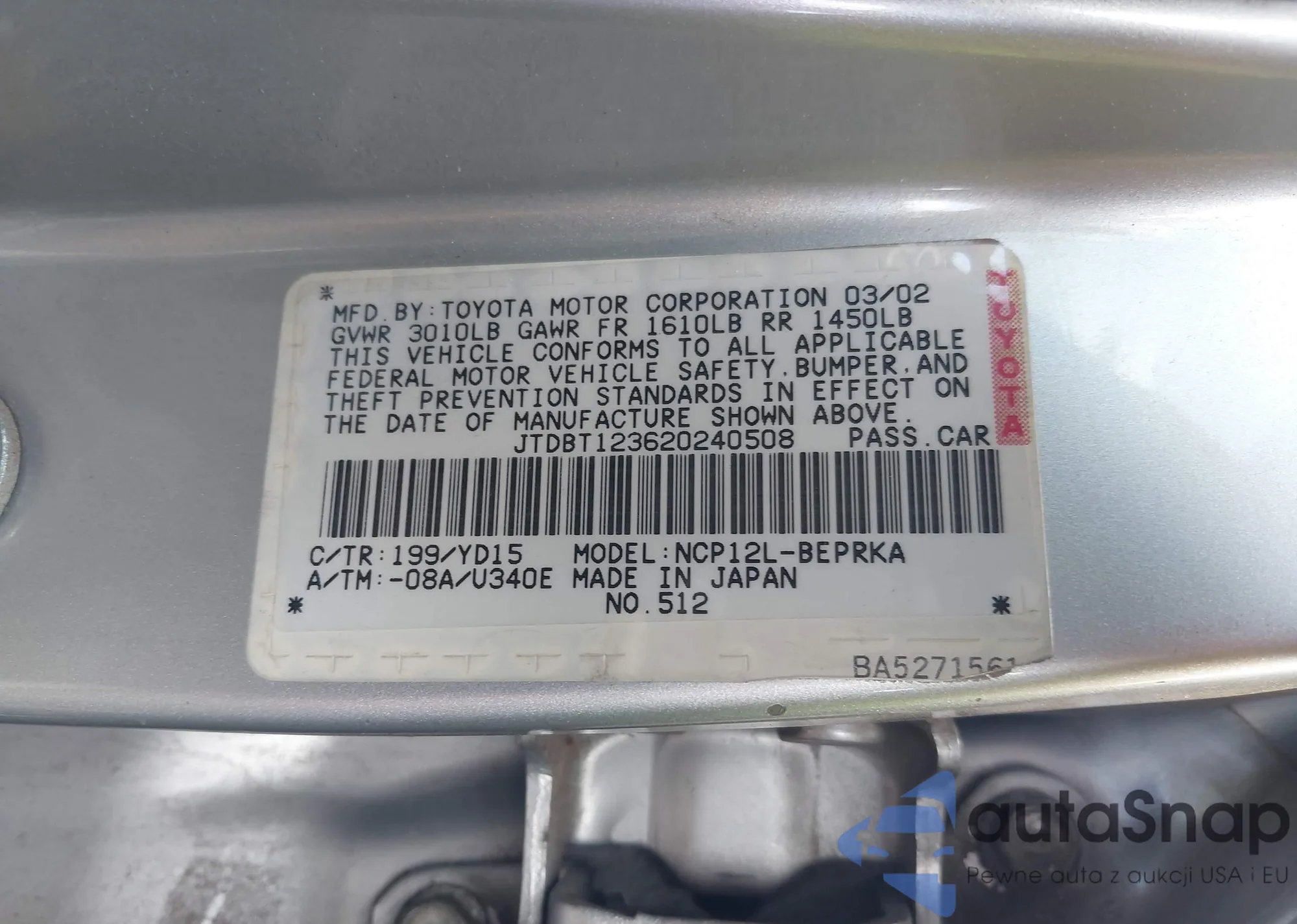 LOT: 40327135 VIN: JTDBT123620240508