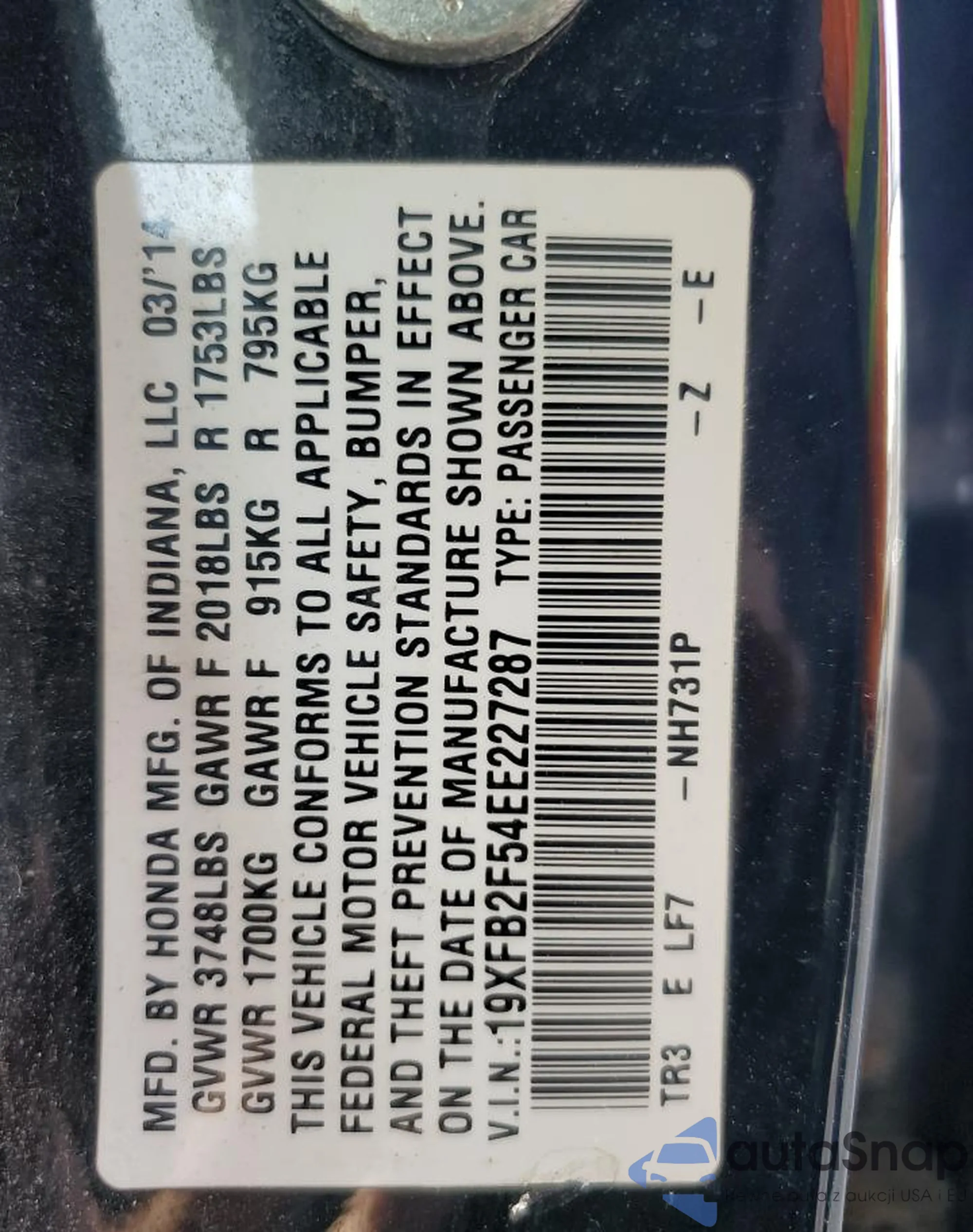 LOT: 62225974 VIN: 1HGES16501L049290