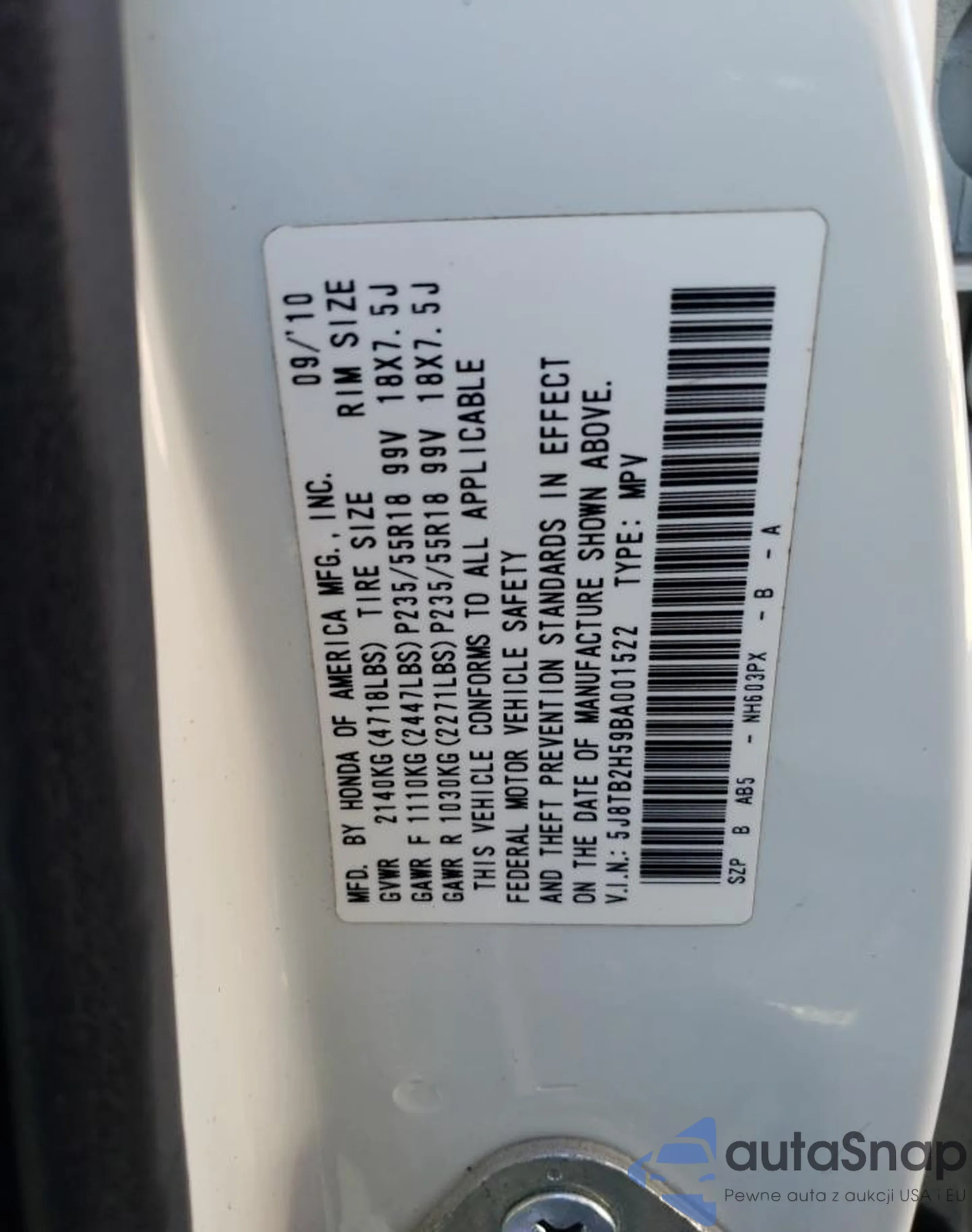 • VIN 5J8TB2H59BA001522