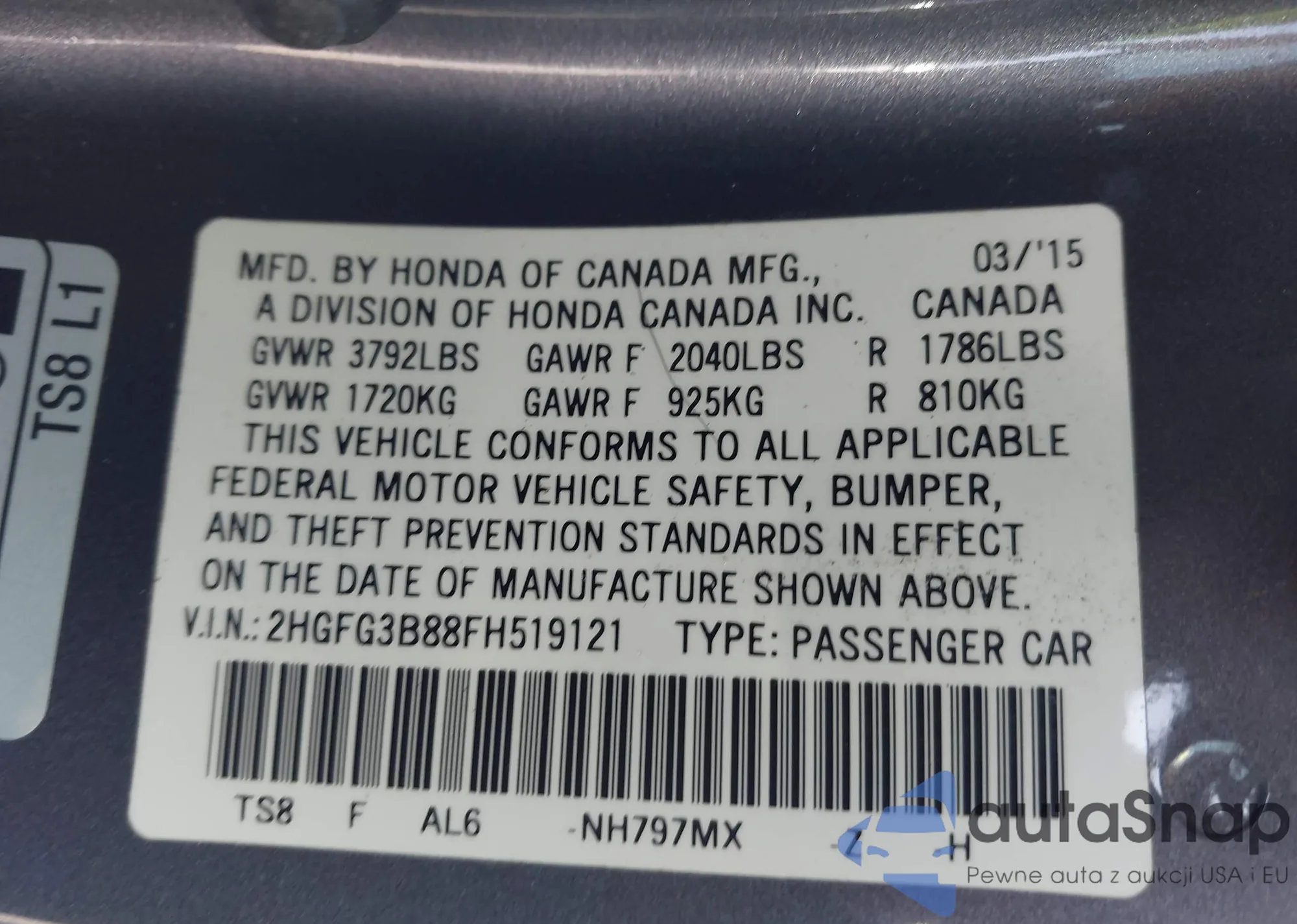 • VIN 2HGFG3B88FH519121