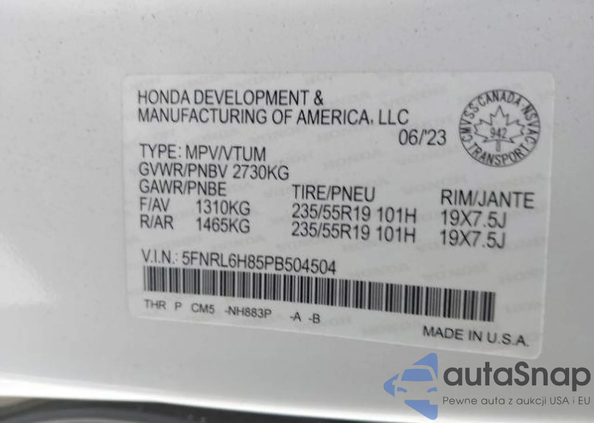LOT: 12223242 VIN: 5FNRL6H85PB504504