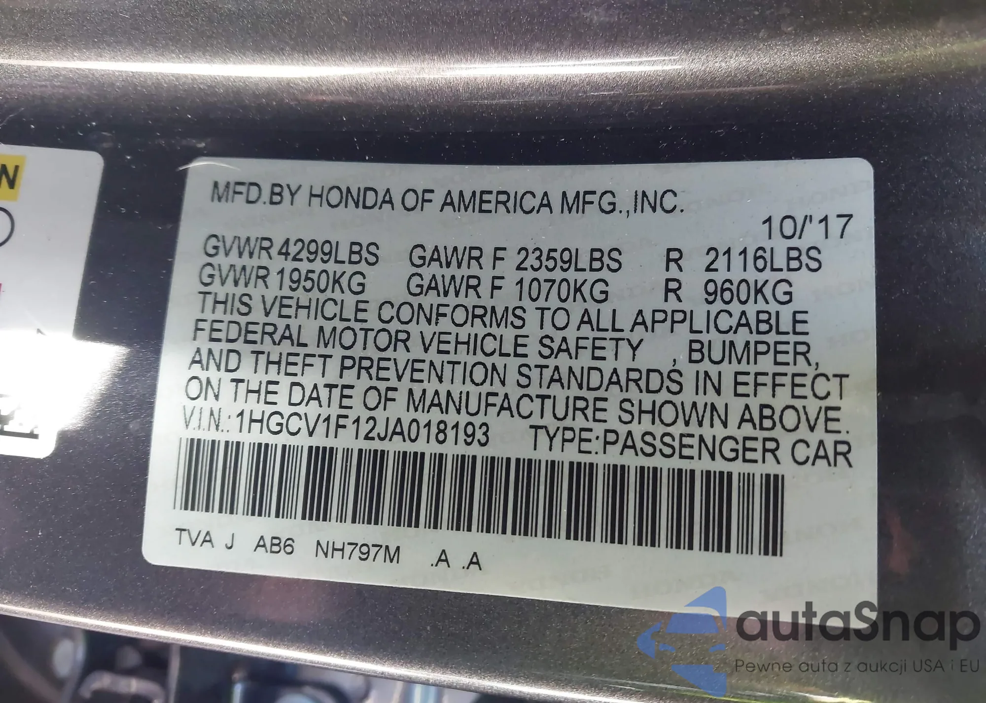 LOT: 41312852 VIN: 1HGCV1F12JA018193