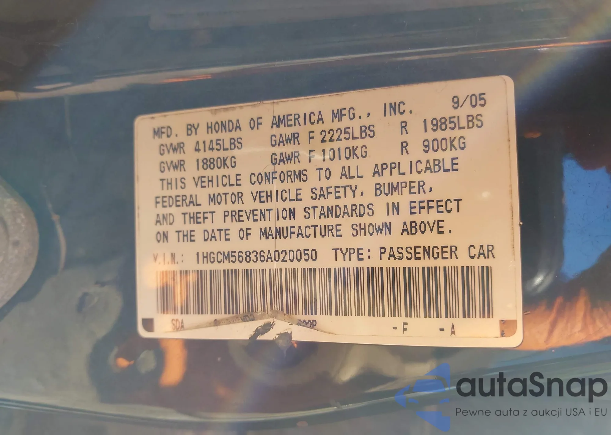 LOT: 41563155 VIN: 1HGCM56836A020050
