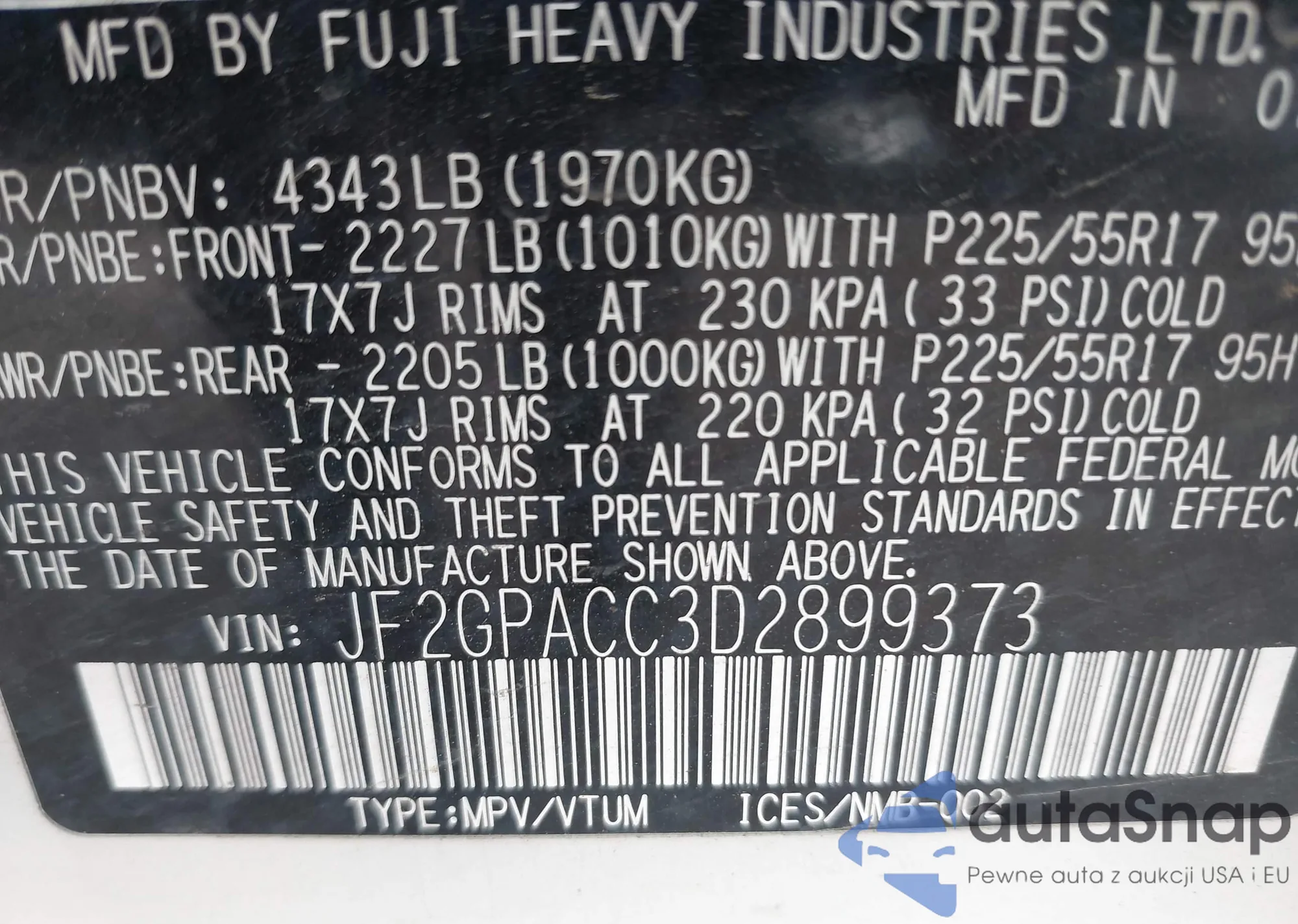 LOT: 39940619 VIN: JF2GPACC3D2899373