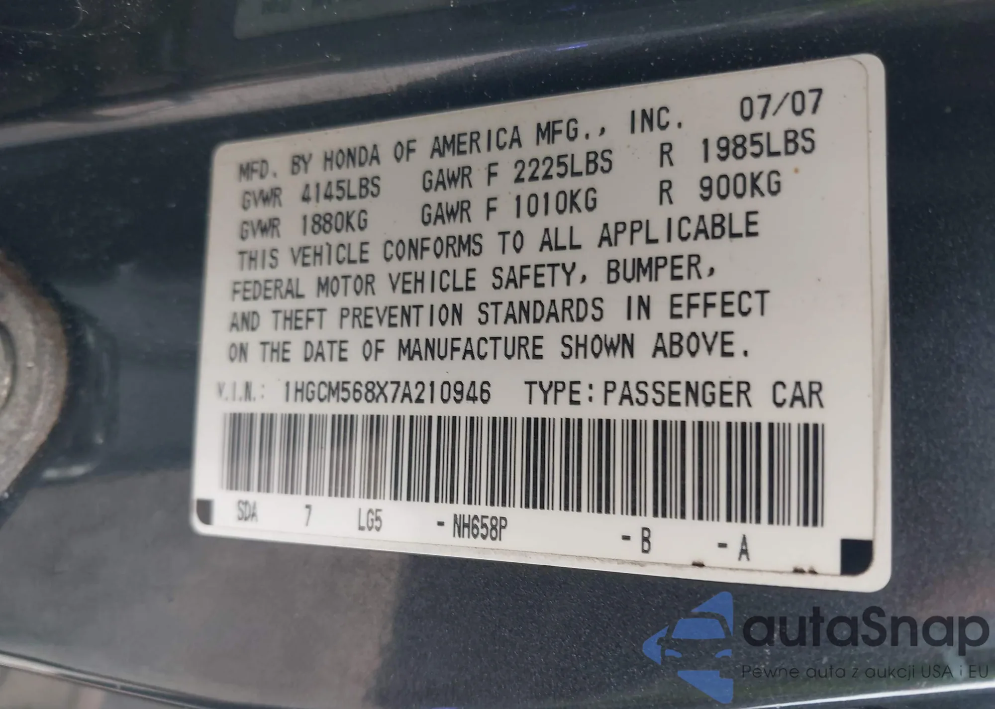 LOT: 40413275 VIN: 1HGCM568X7A210946