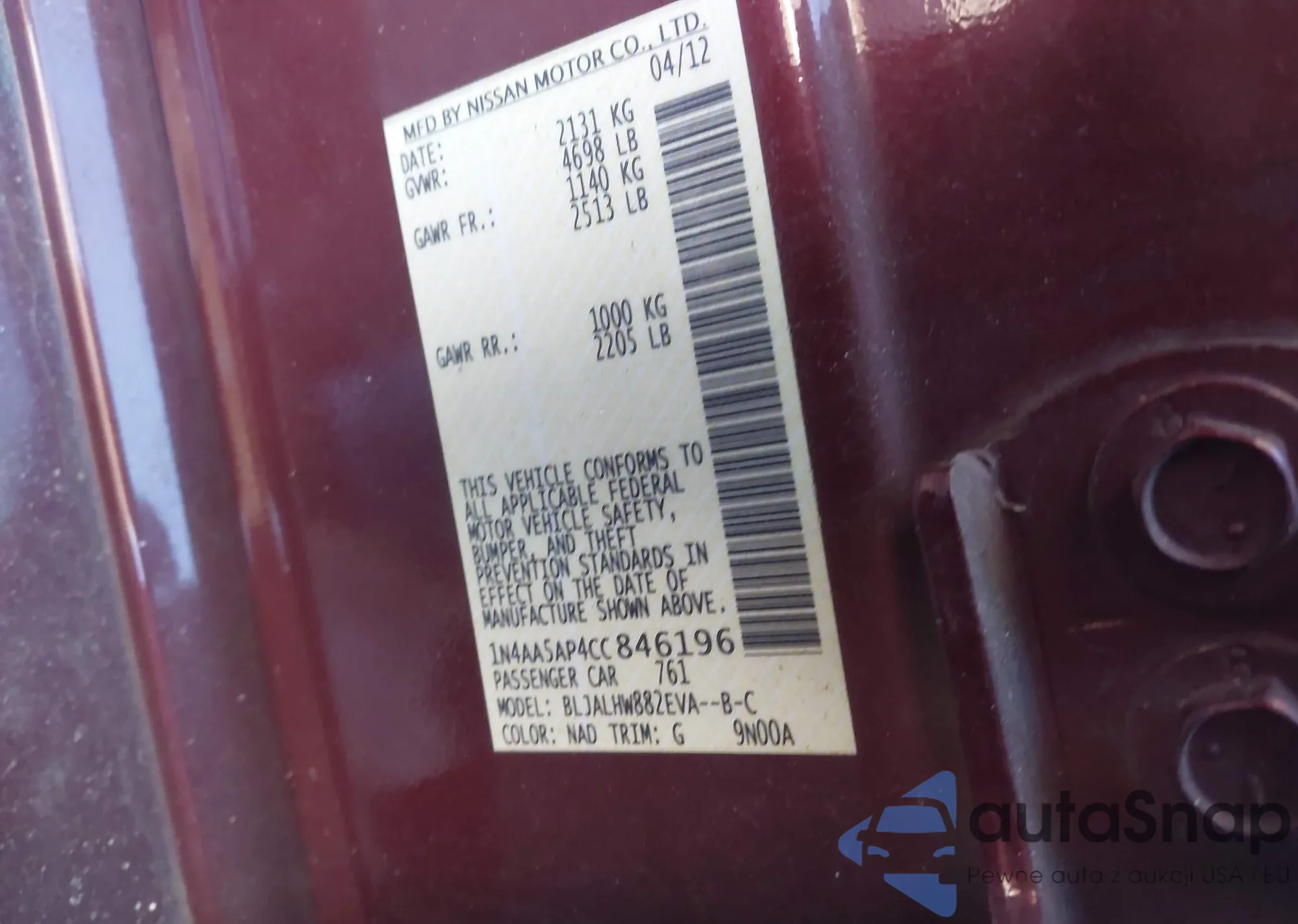 LOT: 41310445 VIN: 1N4AA5AP4CC846196