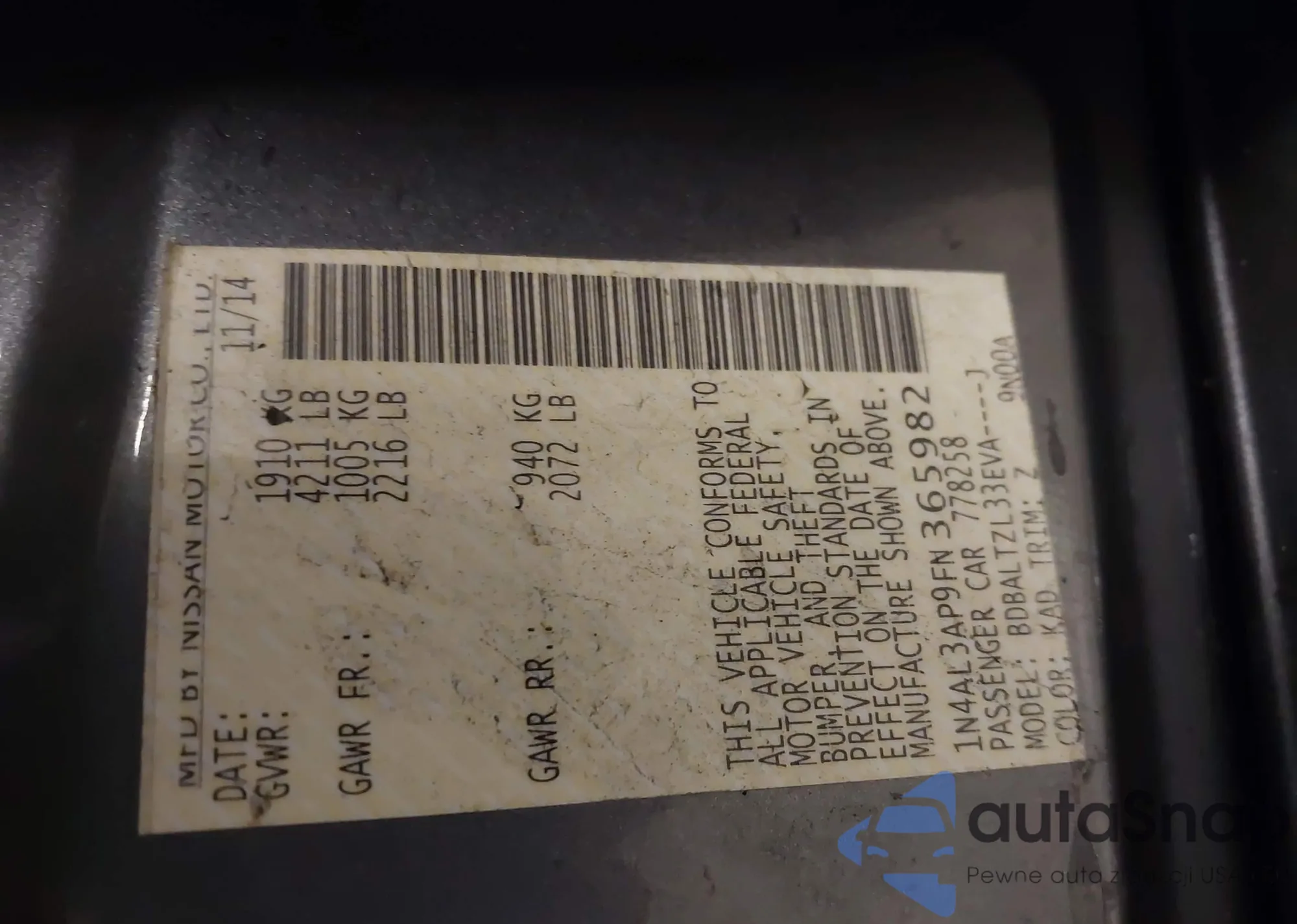 LOT: 41732007 VIN: 1N4AL3AP9FN365982