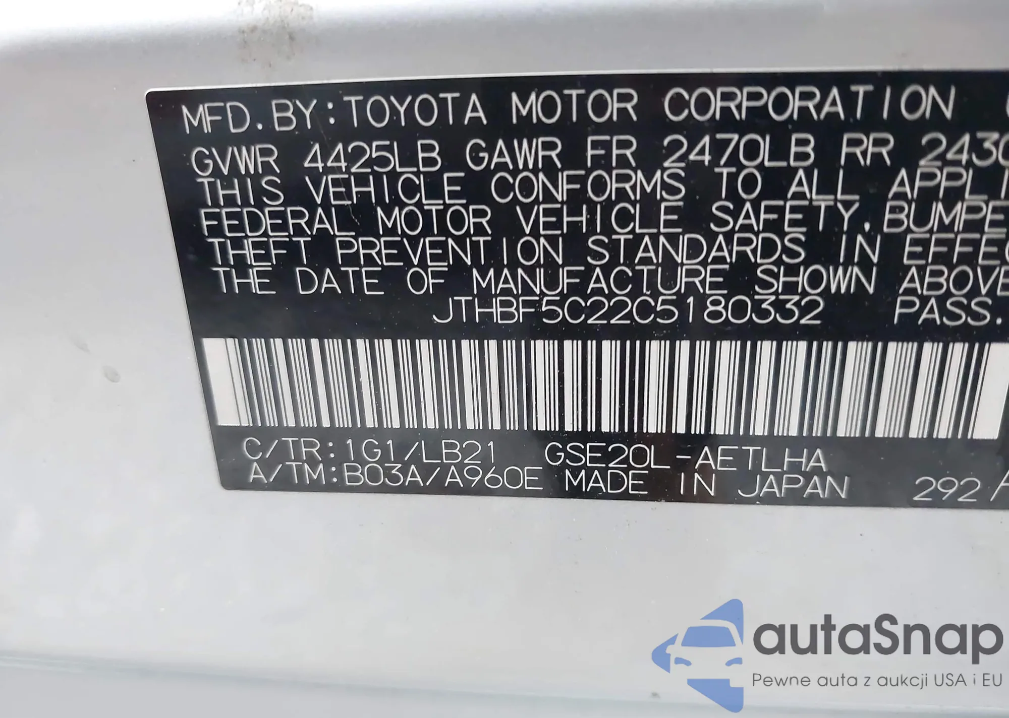 LOT: 41870724 VIN: JTHBF5C22C5180332