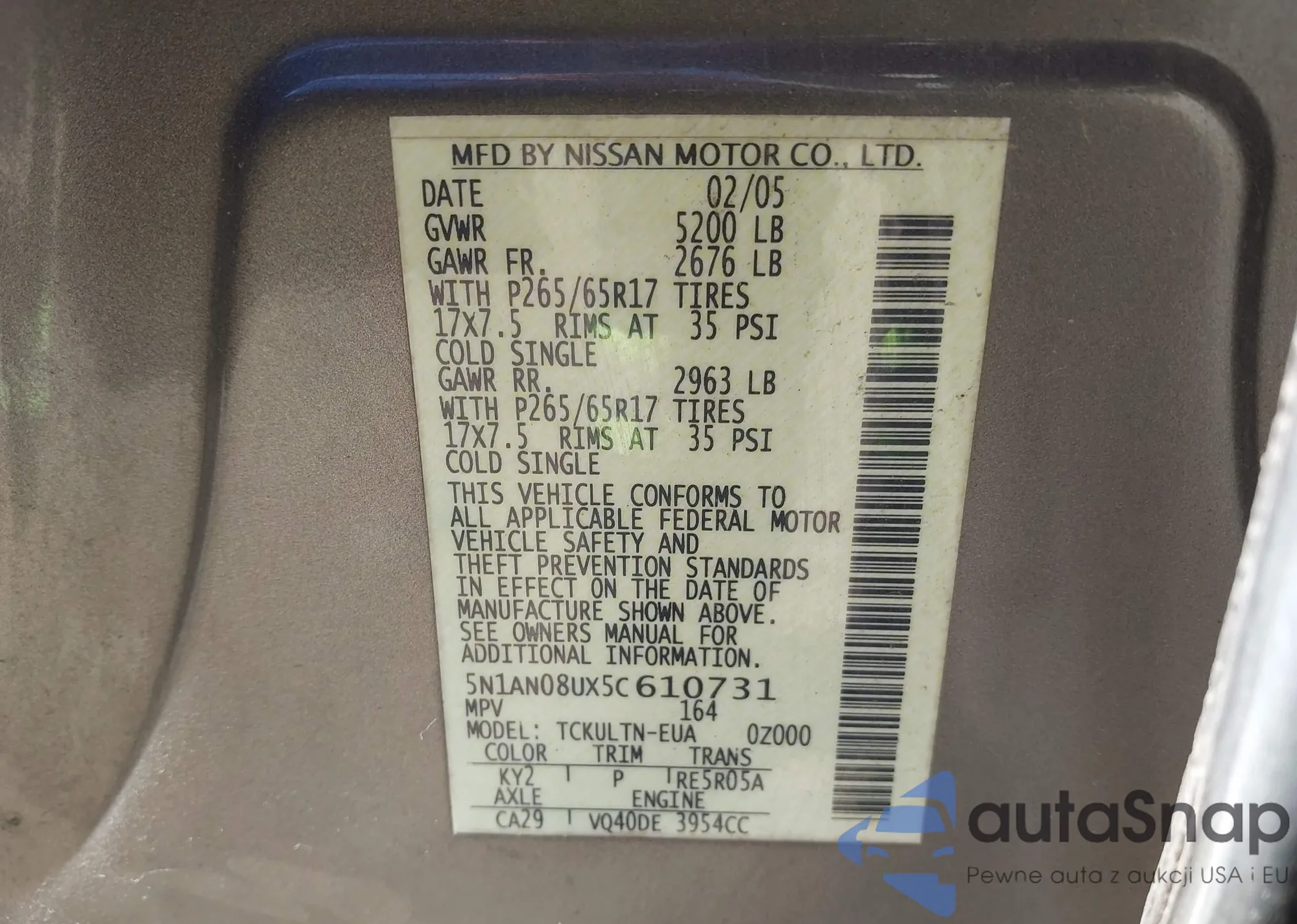 • VIN 5N1AN08UX5C610731