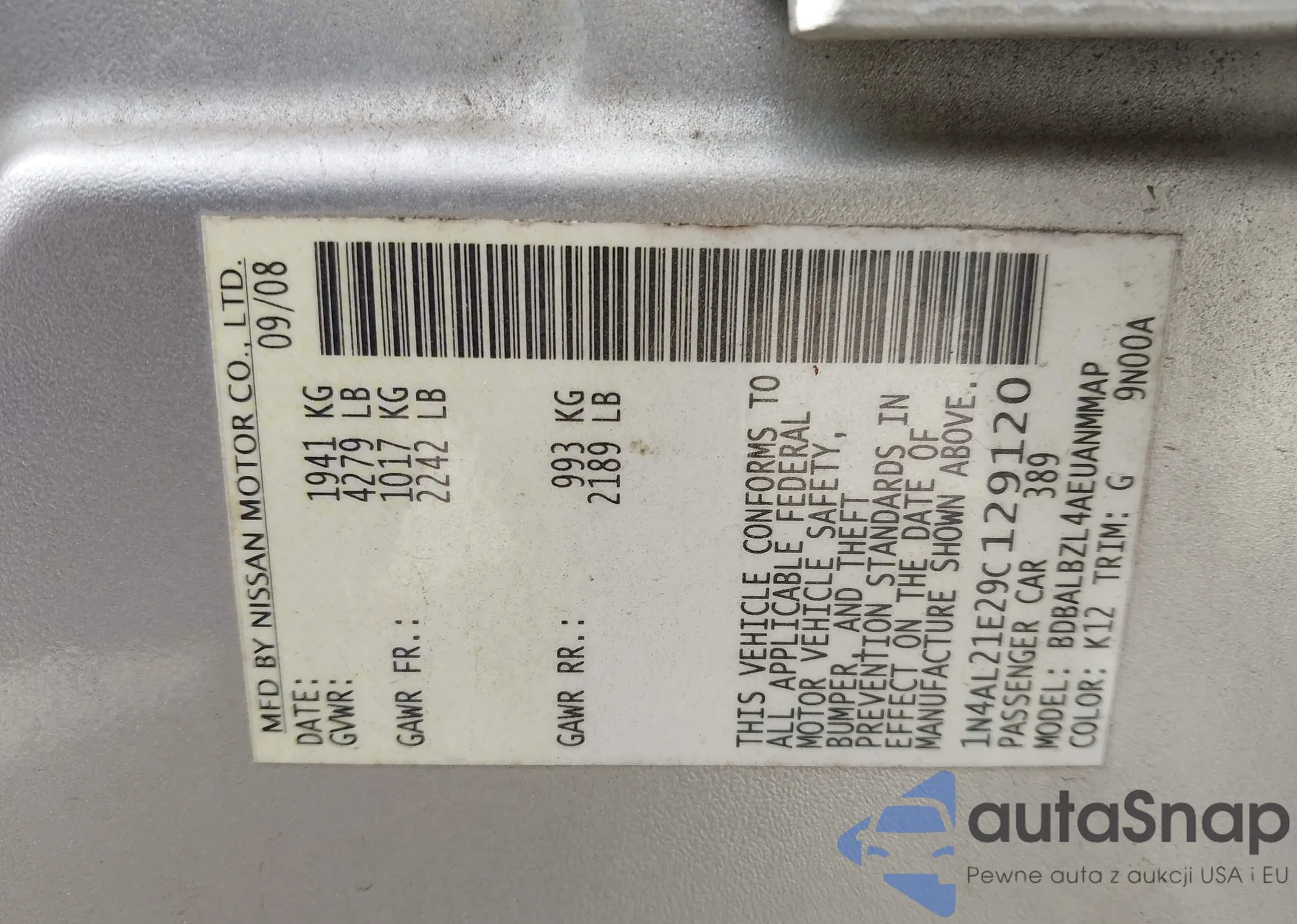 LOT: 39381474 VIN: 1N4AL21E29C129120