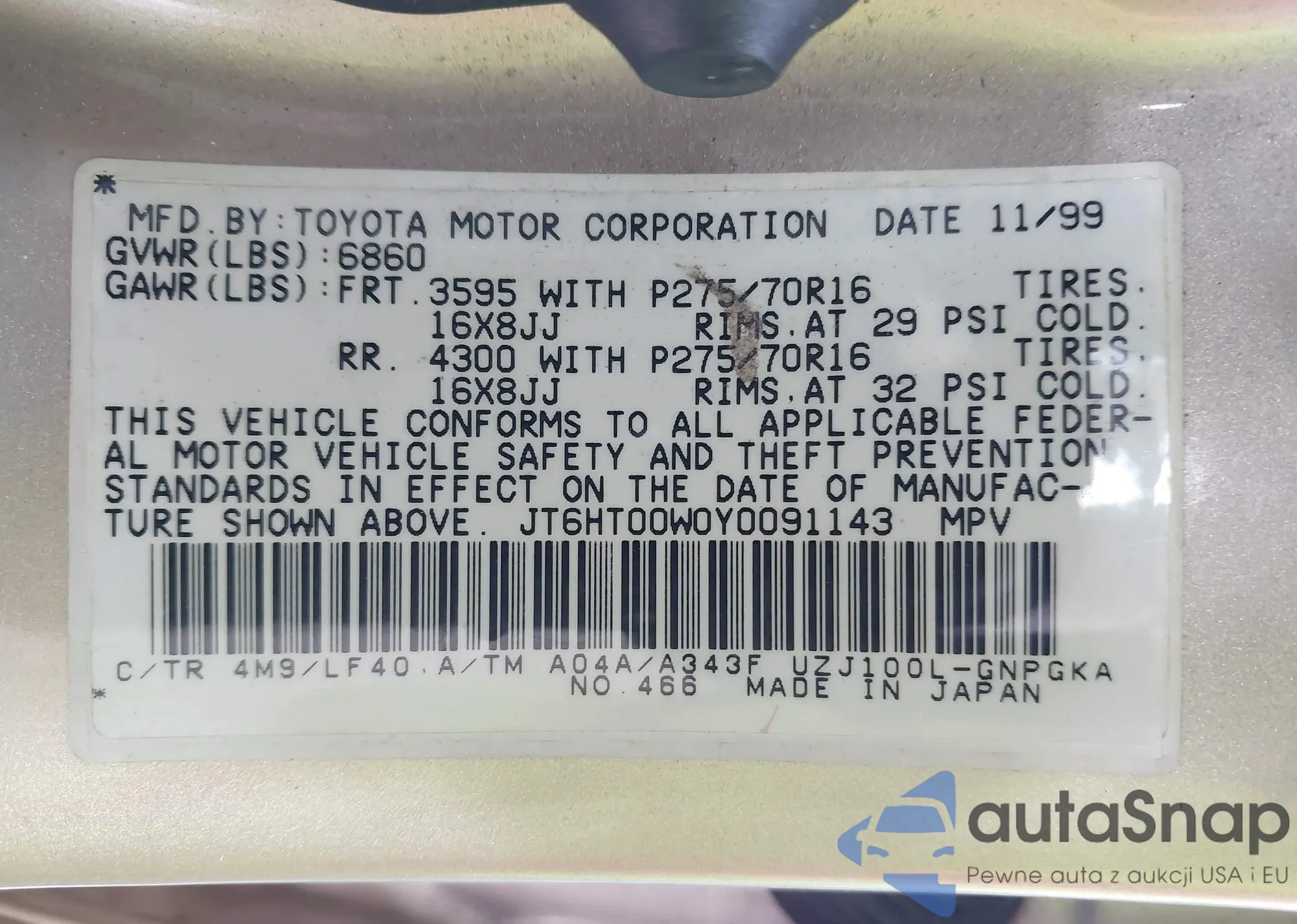 LOT: 41401818 VIN: JT6HT00W0Y0091143