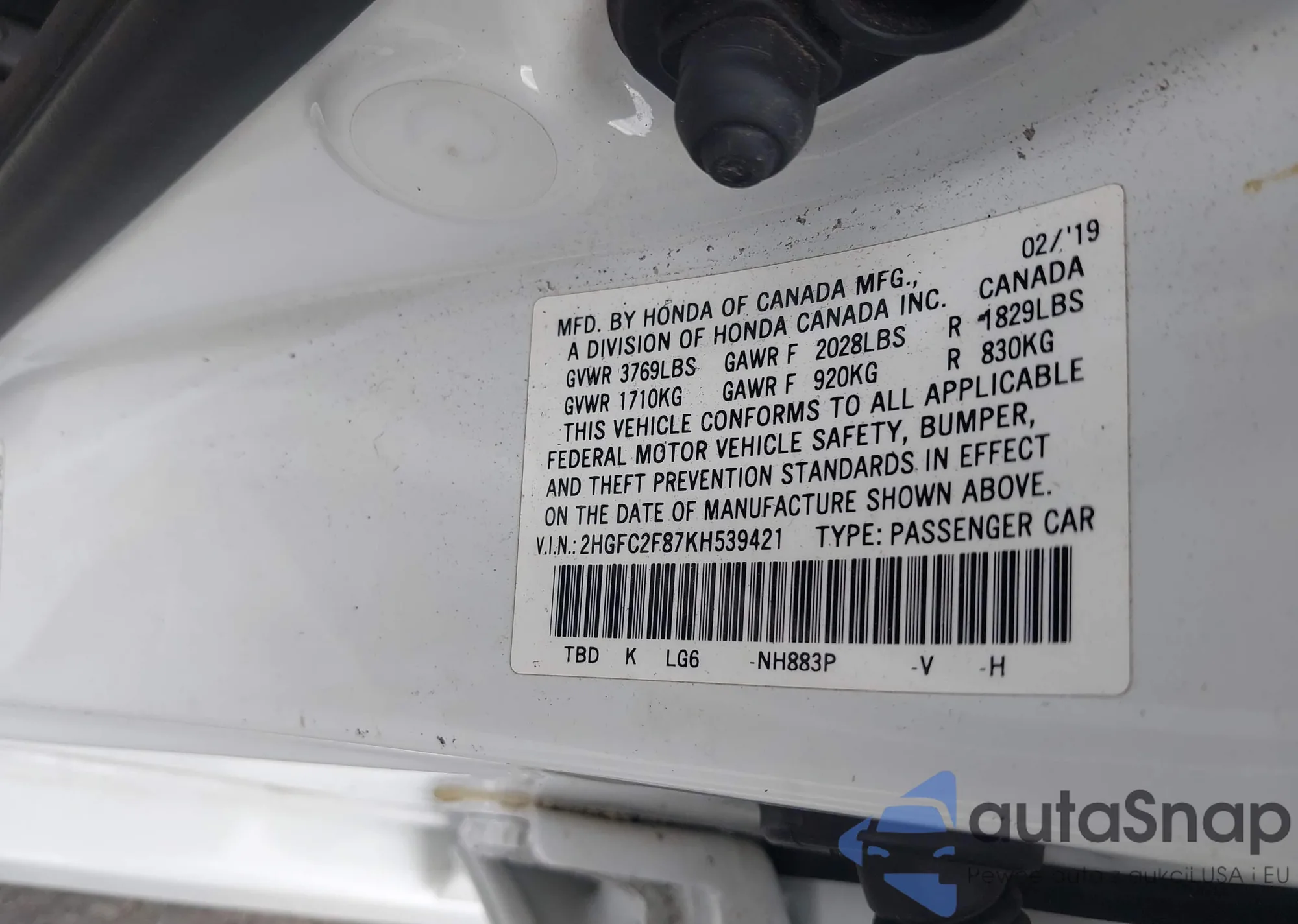 • VIN 2HGFC2F87KH539421