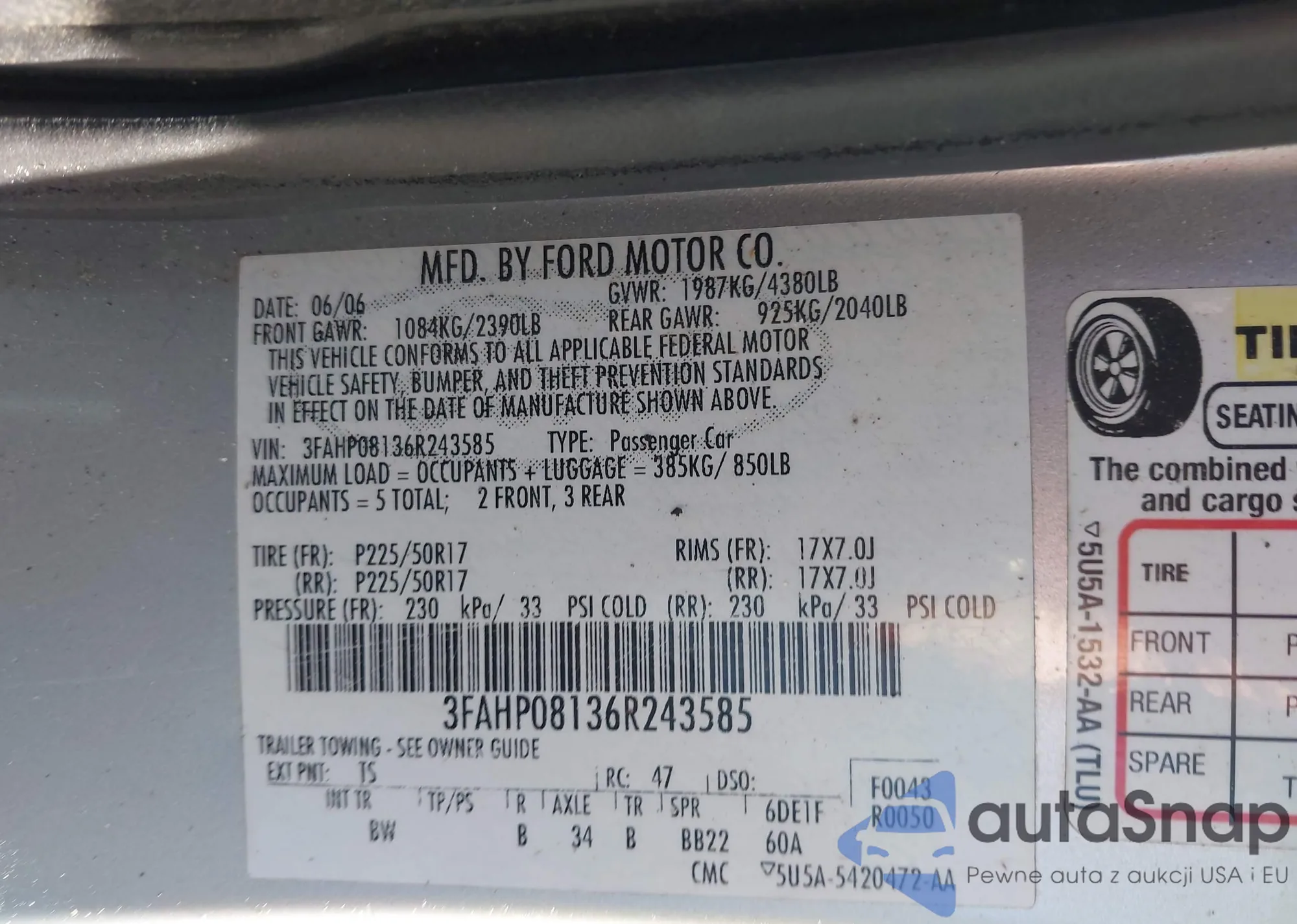 LOT: 41009945 VIN: 3FAHP08136R243585