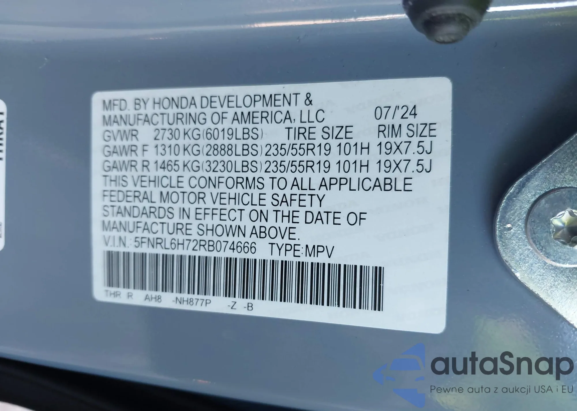• VIN 5FNRL6H72RB074666