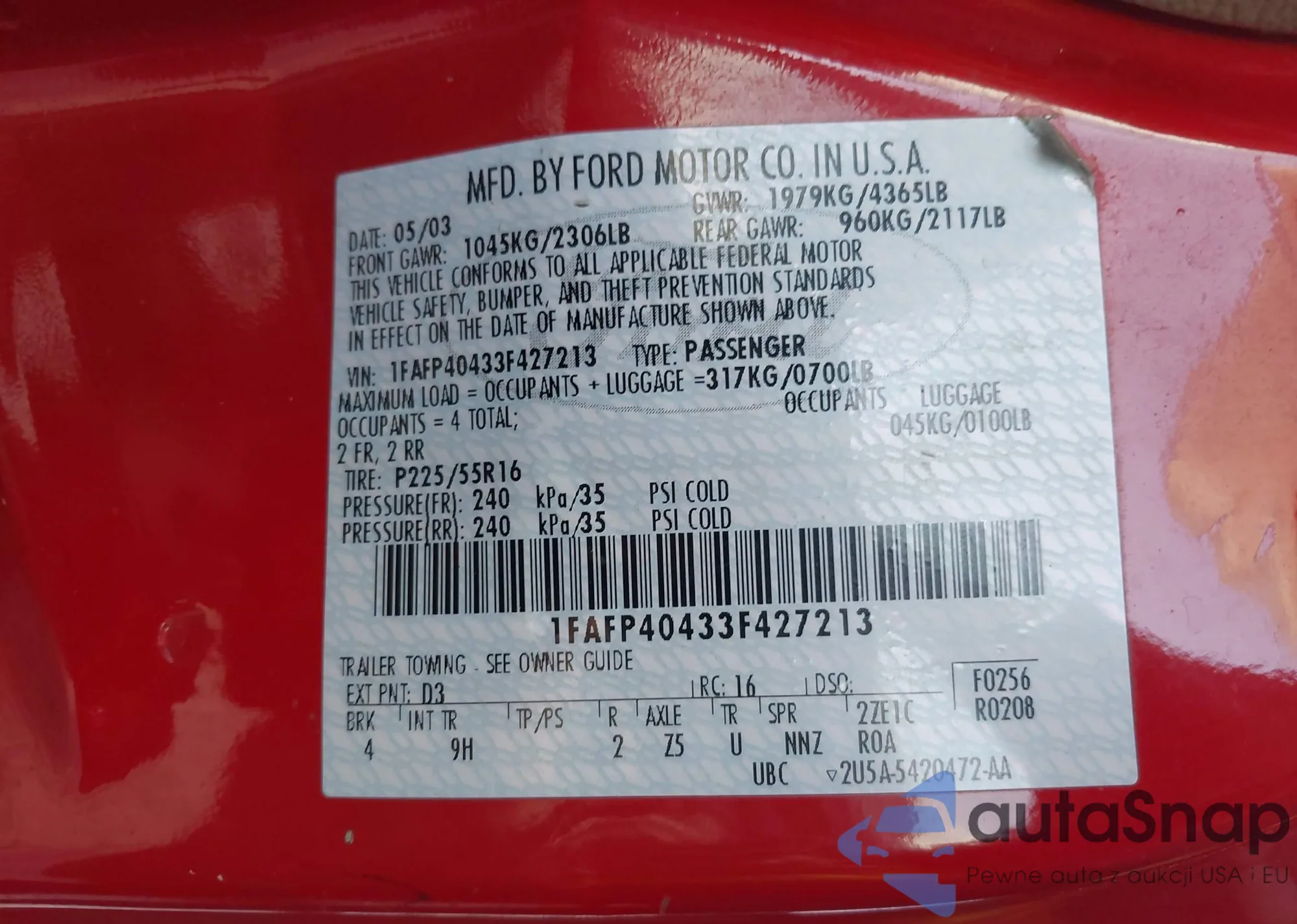 LOT: 41947502 VIN: 1FAFP40433F427213