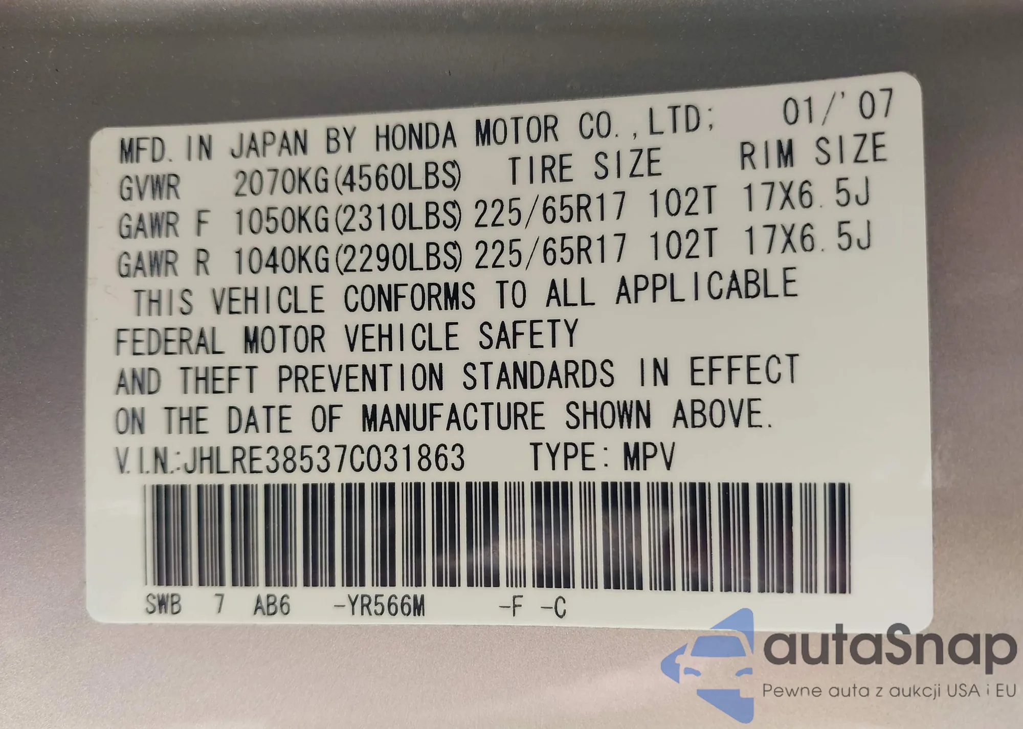 • VIN JHLRE38537C031863