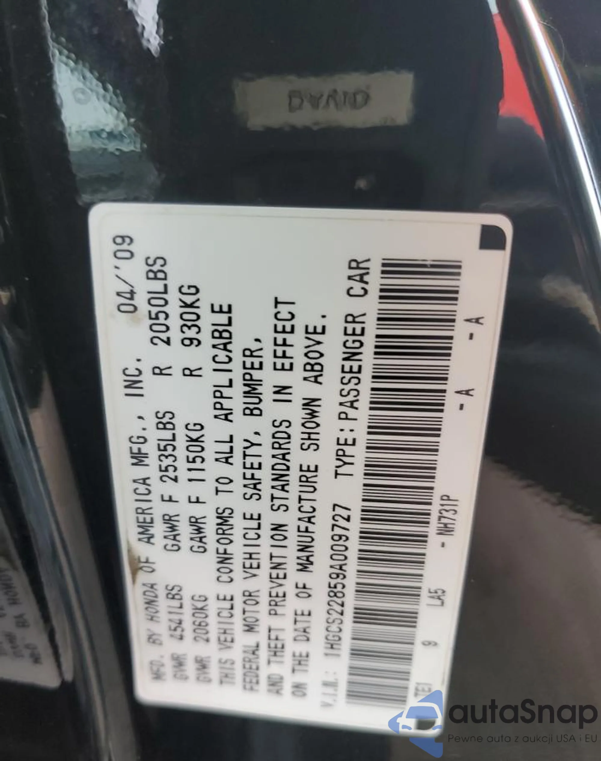 LOT: 84954174 VIN: 1HGCS22859A009727