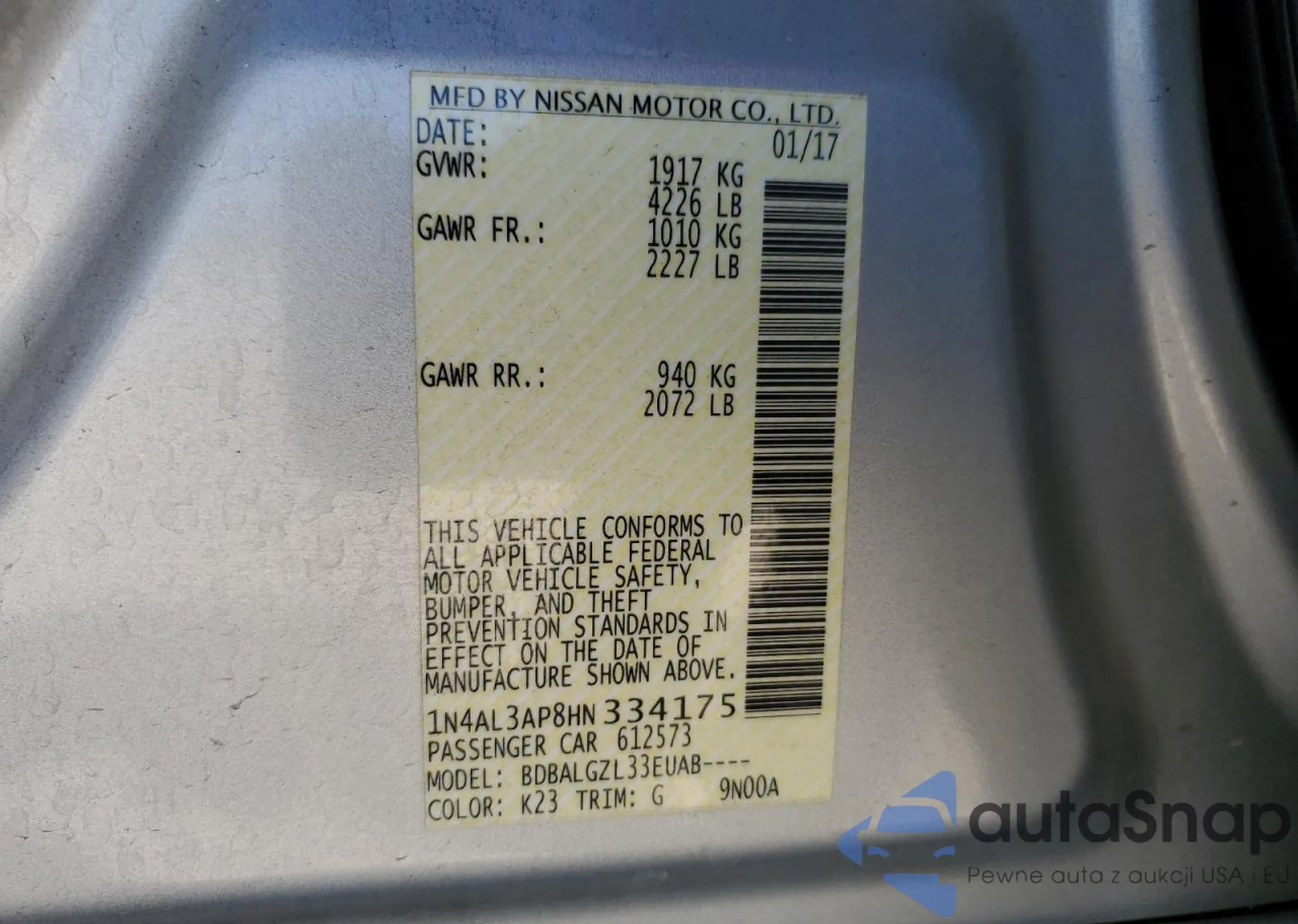 LOT: 49681655 VIN: 1N4AL3AP8HN334175