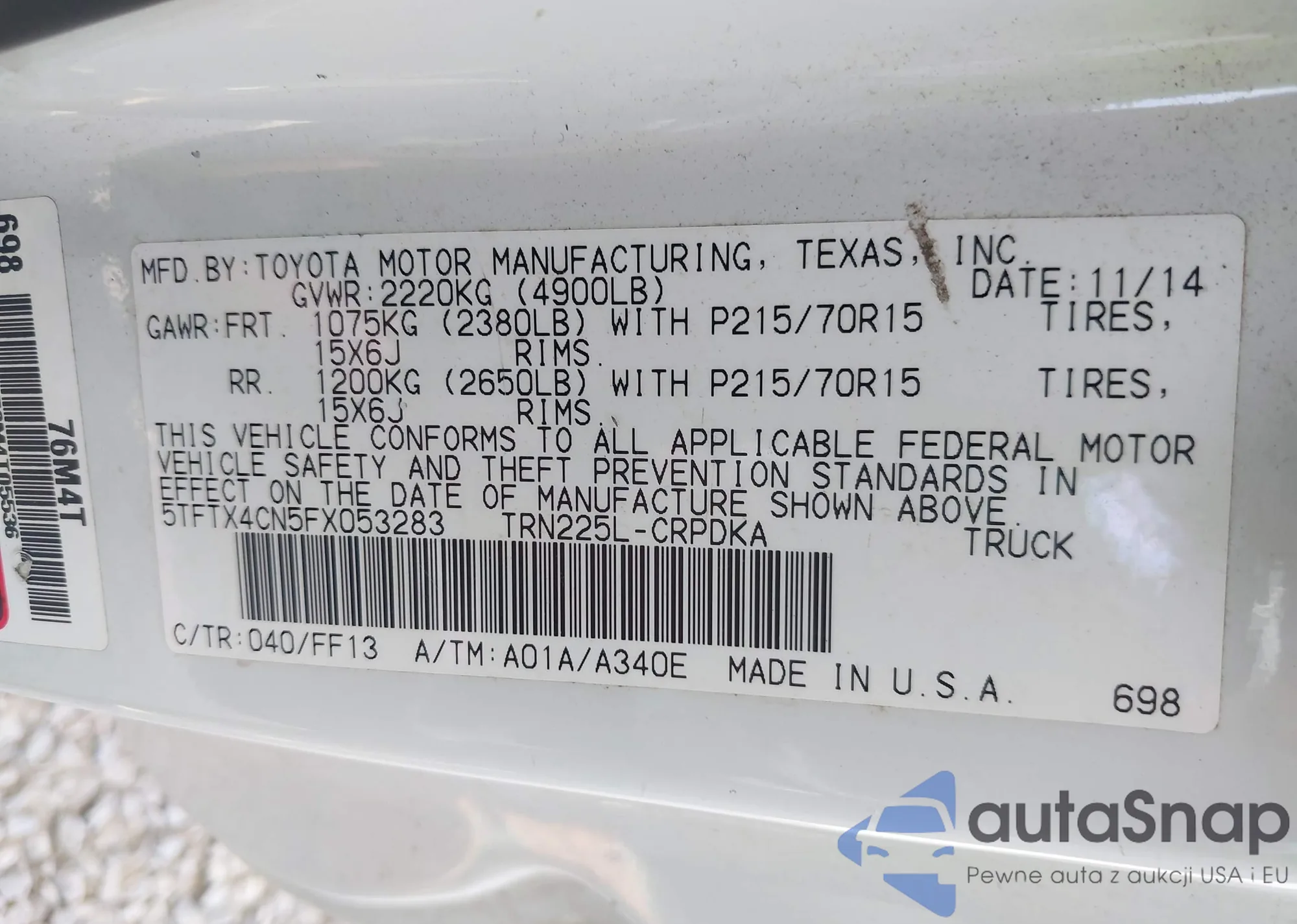 LOT: 40318477 VIN: 5TFTX4CN5FX053283