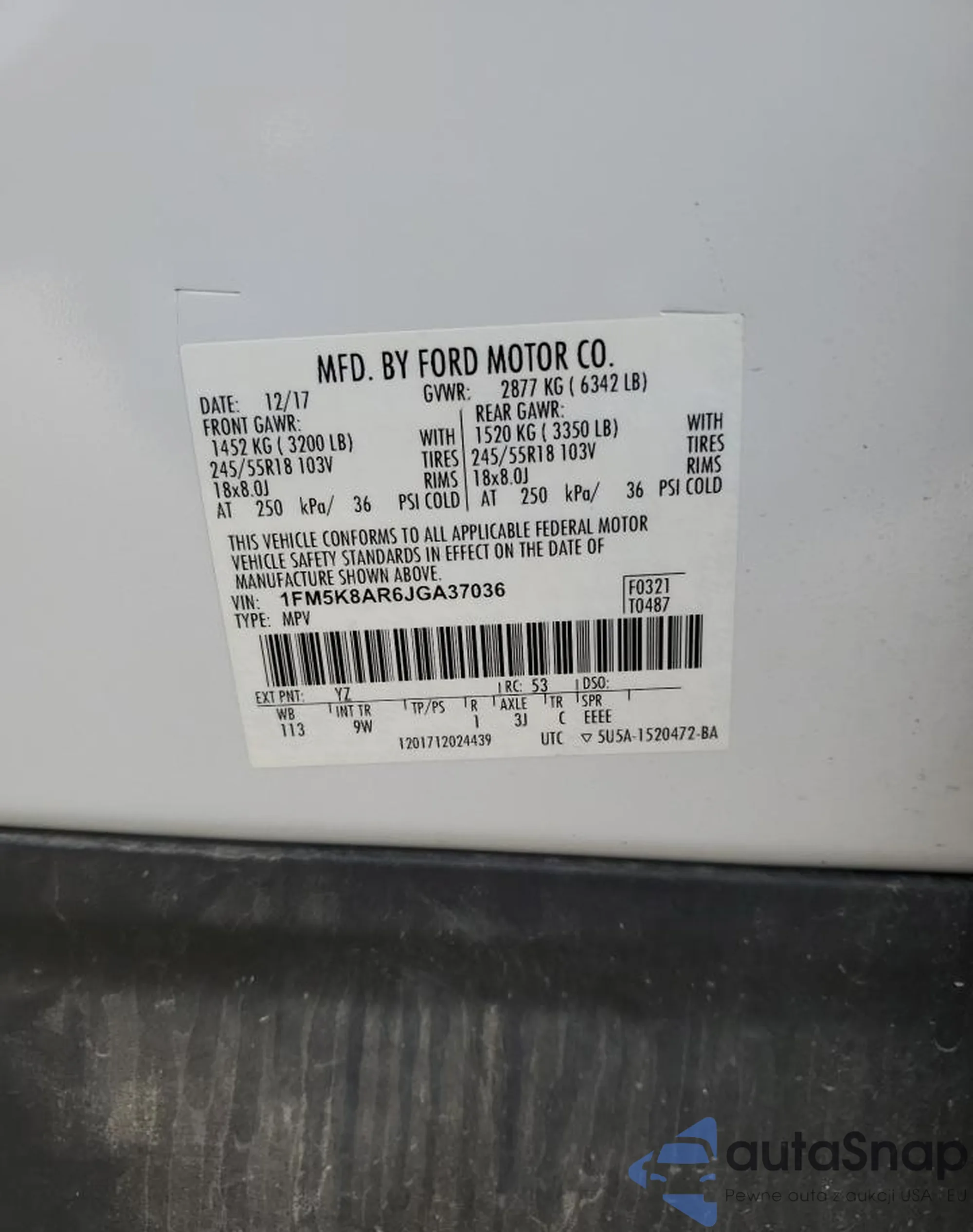 LOT: 79996174 VIN: 1FM5K8AR6JGA37036
