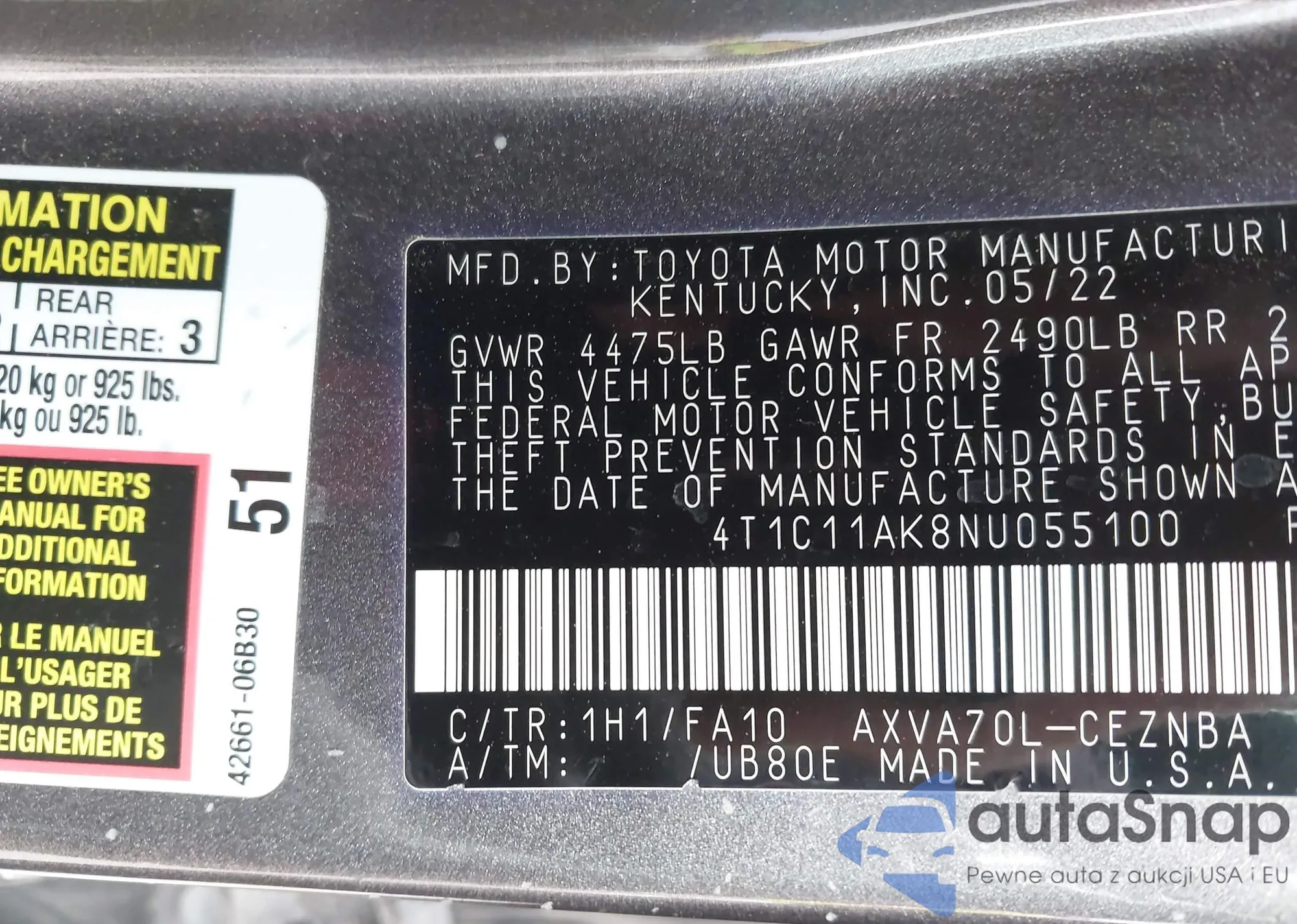 LOT: 41434984 VIN: 4T1C11AK8NU055100