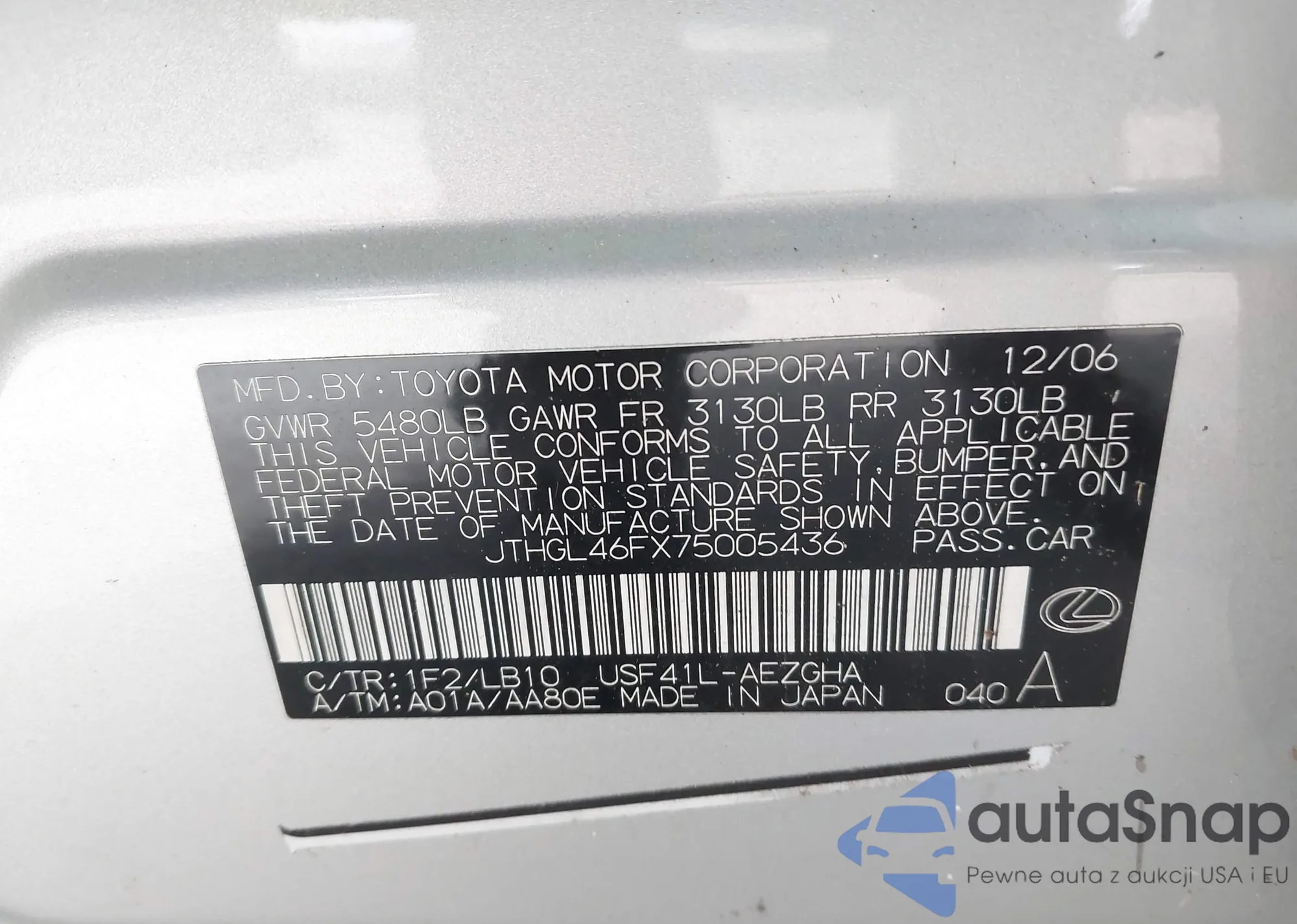 • VIN JTHGL46FX75005436