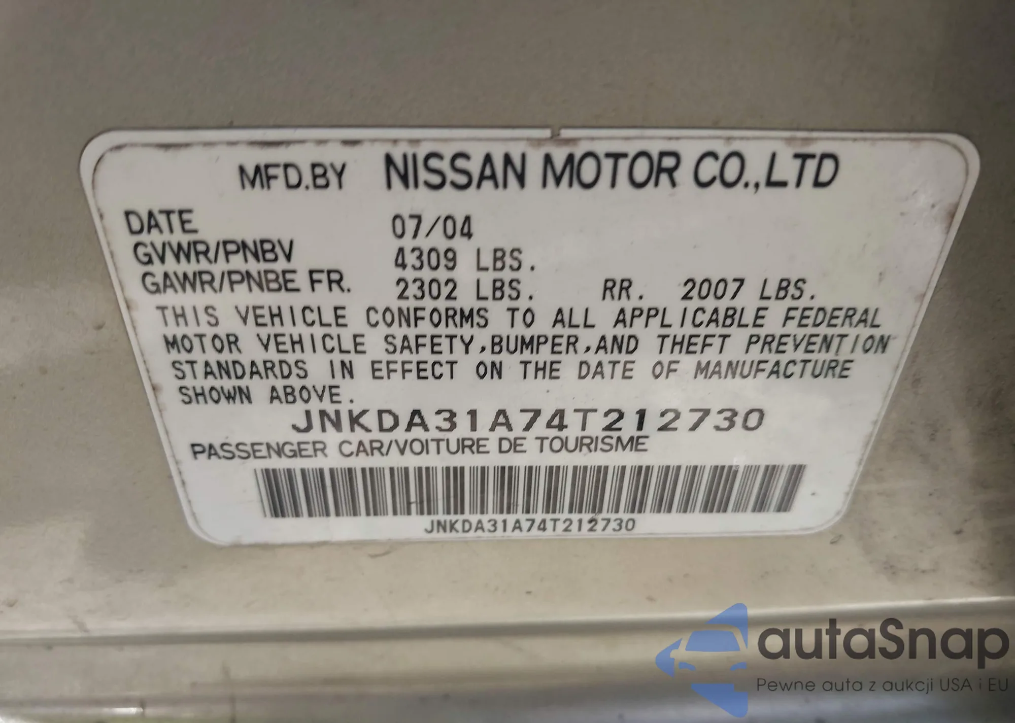 • VIN JNKDA31A74T212730