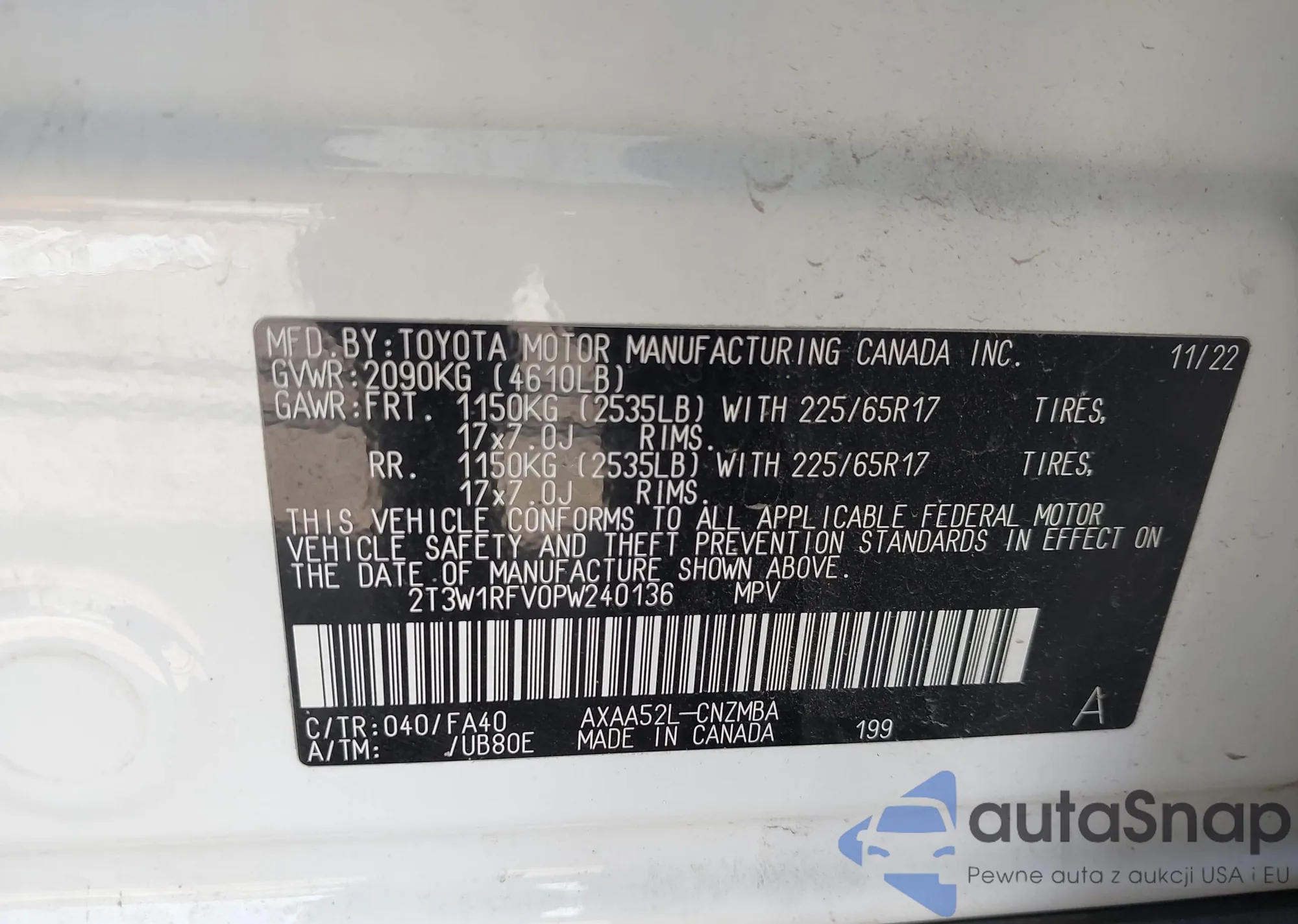 LOT: 42002500 VIN: 2T3W1RFV0PW240136
