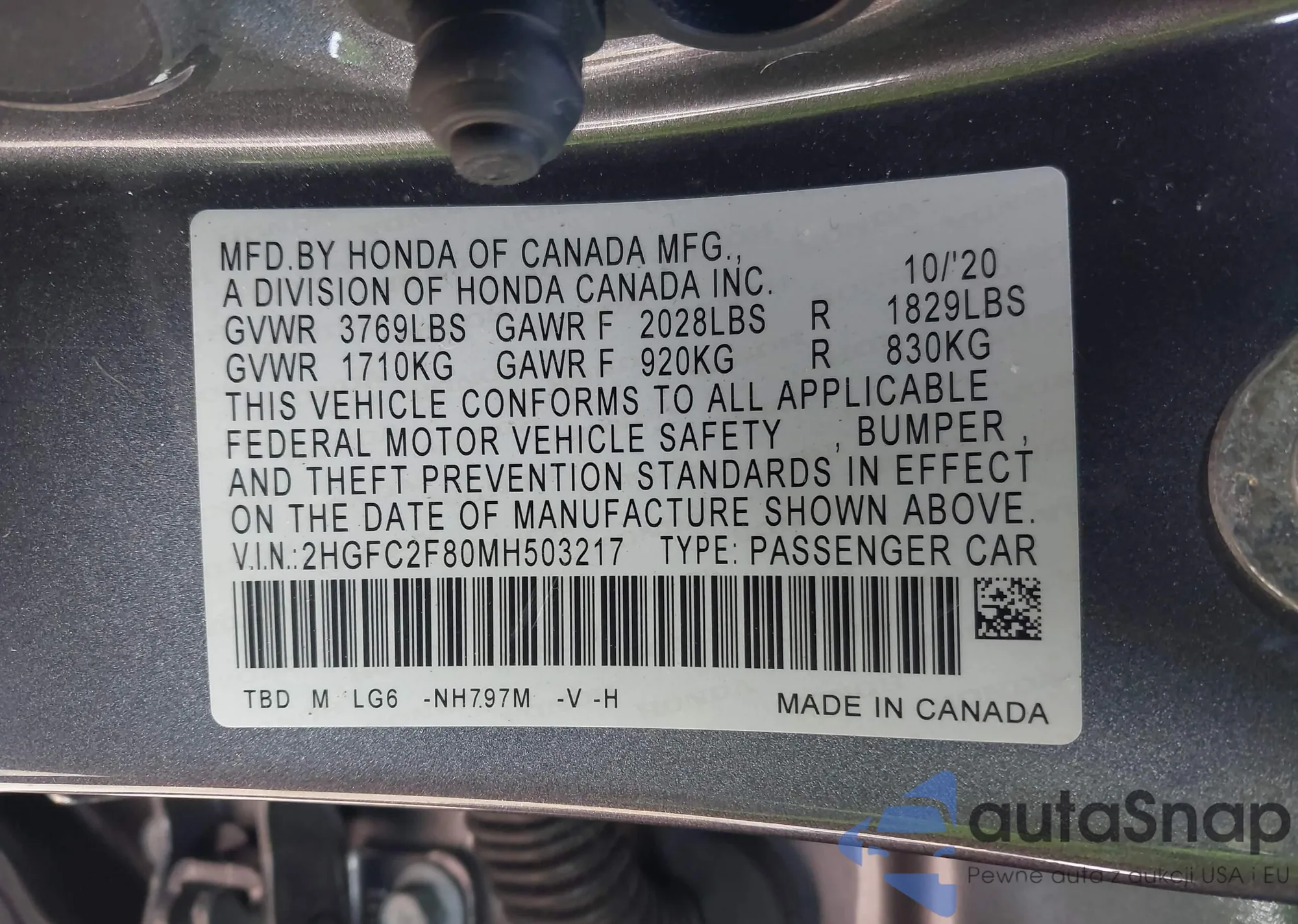 • VIN 2HGFC2F80MH503217