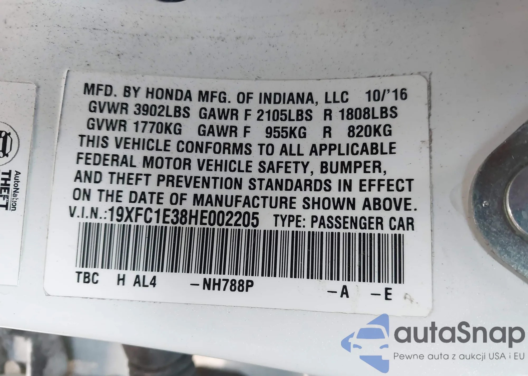 LOT: 40891678 VIN: 19XFC1E38HE002205