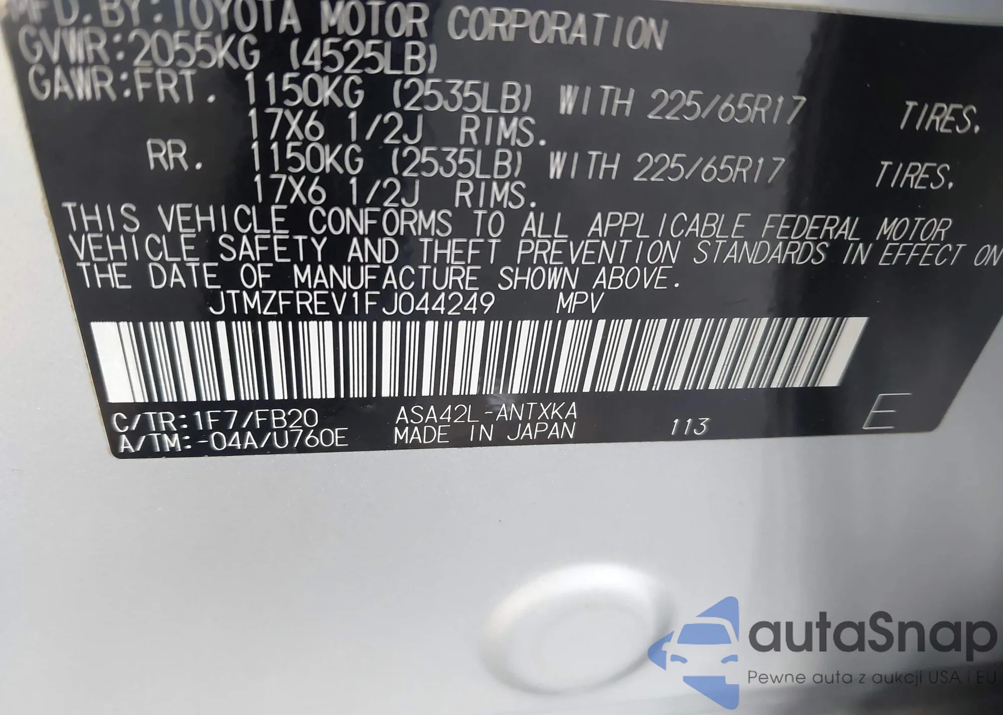 LOT: 41788619 VIN: JTMZFREV1FJ044249