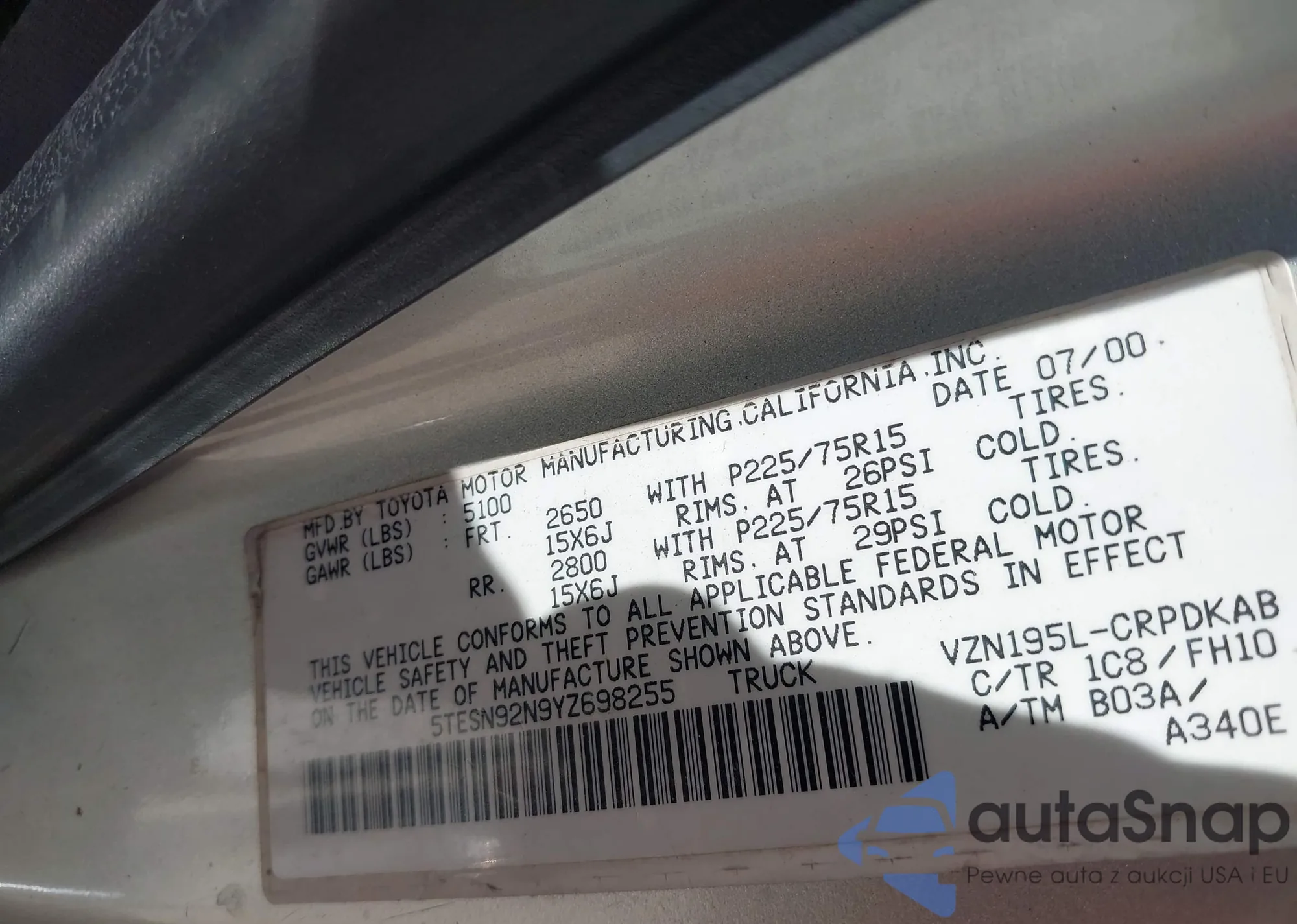 LOT: 41992975 VIN: 5TESN92N9YZ698255
